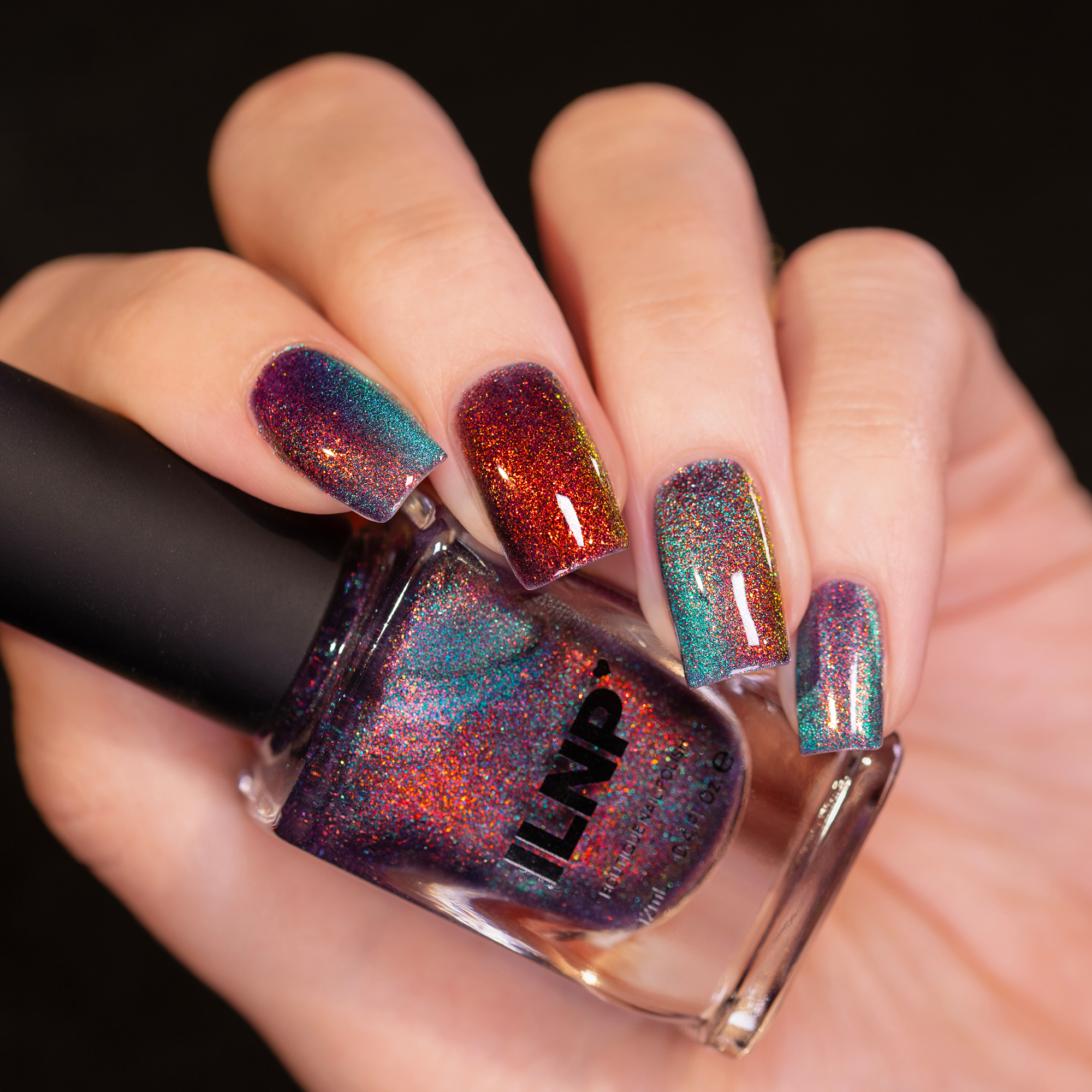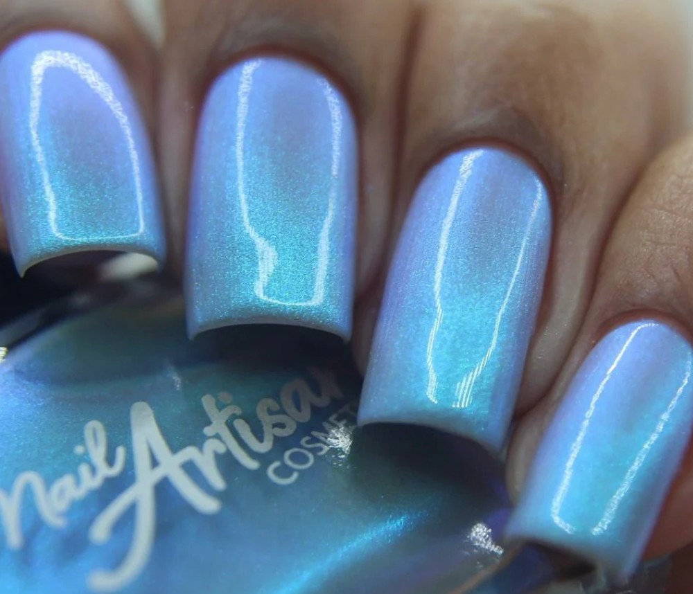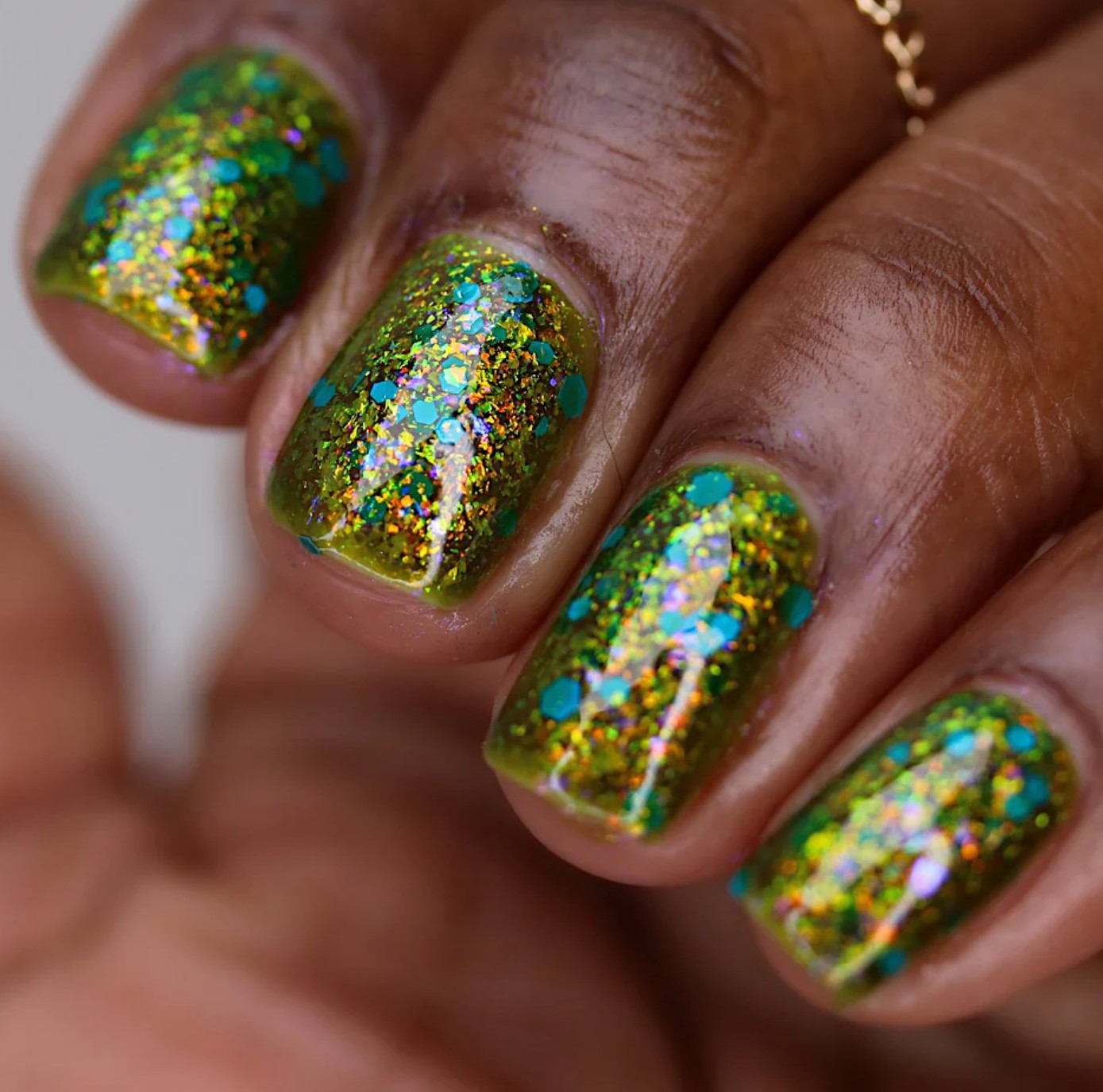 Multichrome lacquer that shifts between shades of green, teal, yellow, and blue