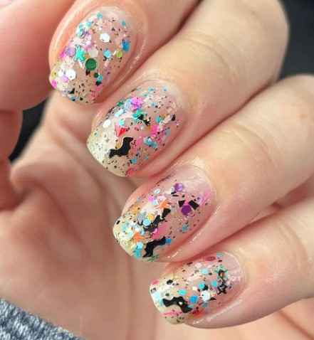 Light blue base with orange to green iridescent shimmer scattered with black and holo irregular glitter