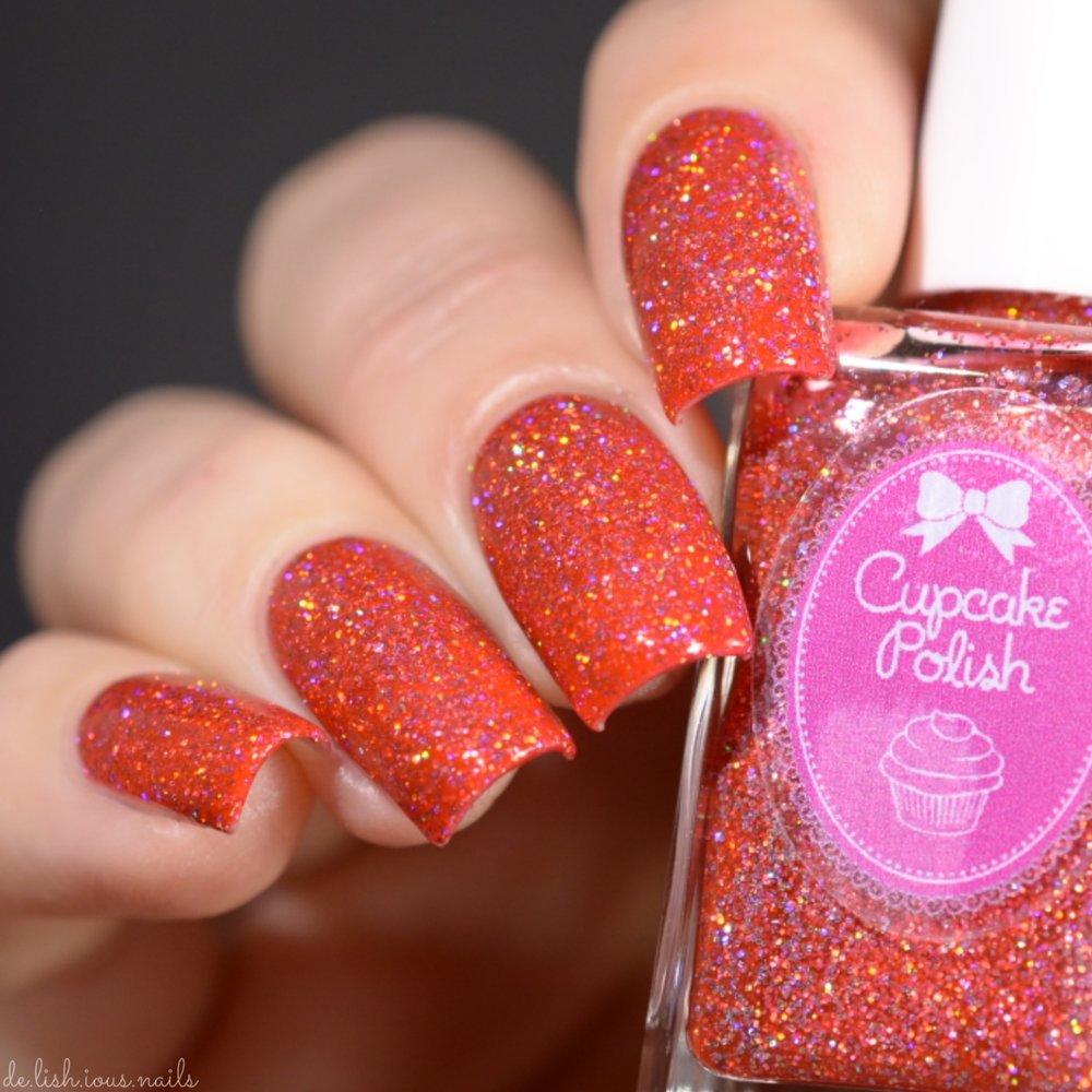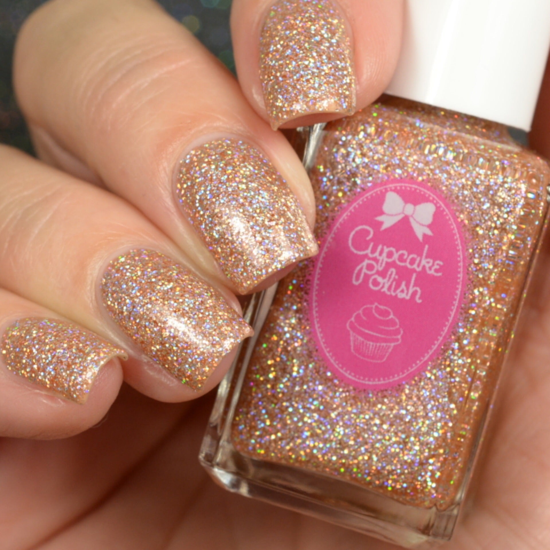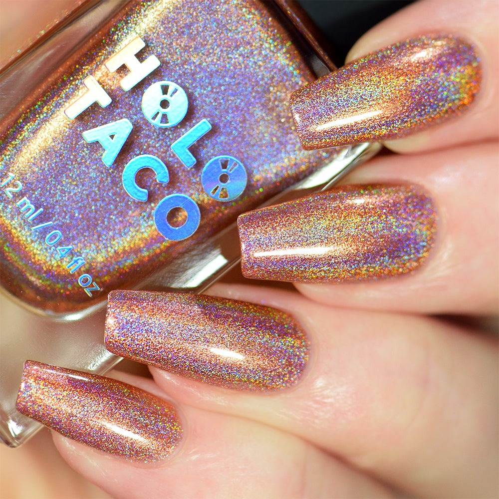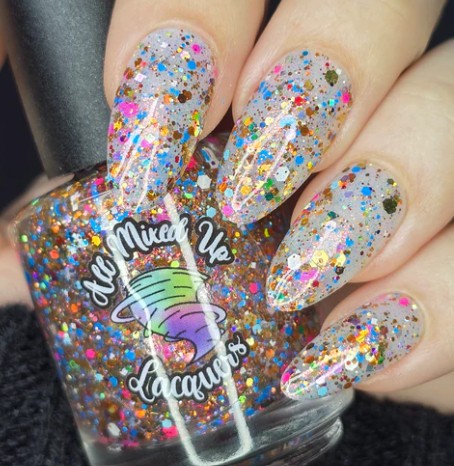 Light red/gold shimmer base filled with a plethora of iridescent, blue, pink, white, red, orange, silver, and green glitters in a variety of holographic, metallic, and matte