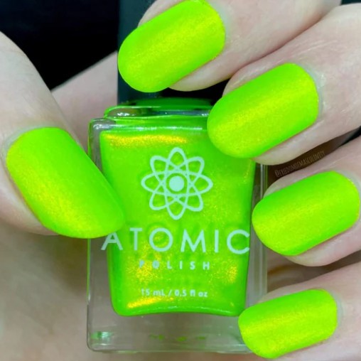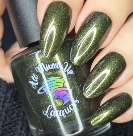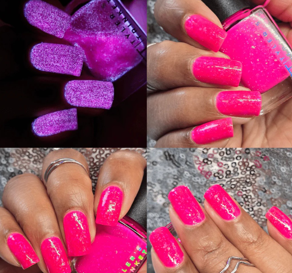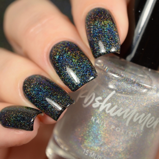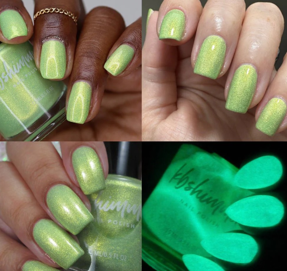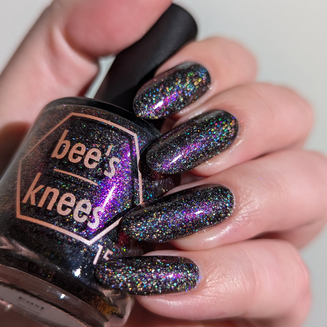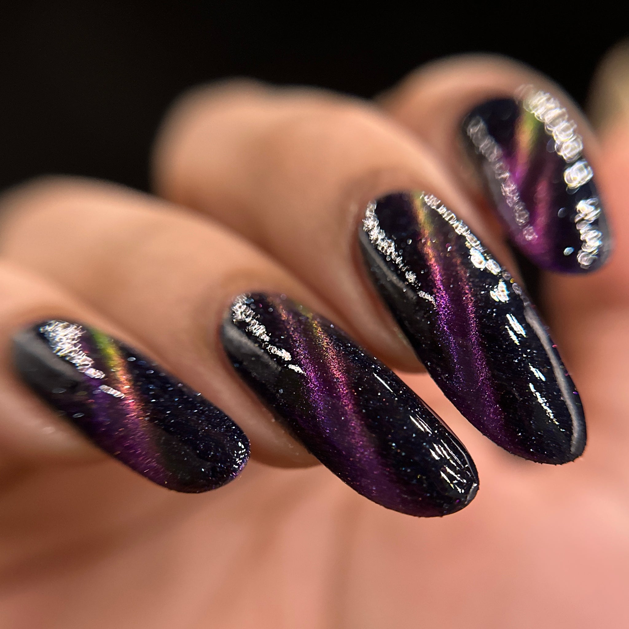 Black base with purple reflective glitter, green iridescent flakes, a pink to purple aurora shimmer, a bluish purple magnetic effect and a green glow in the dark effect