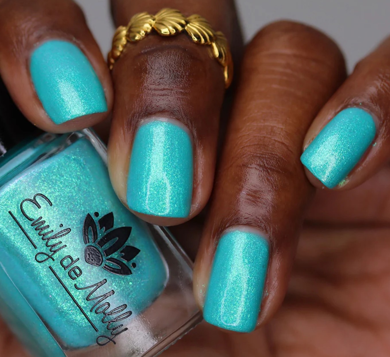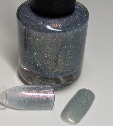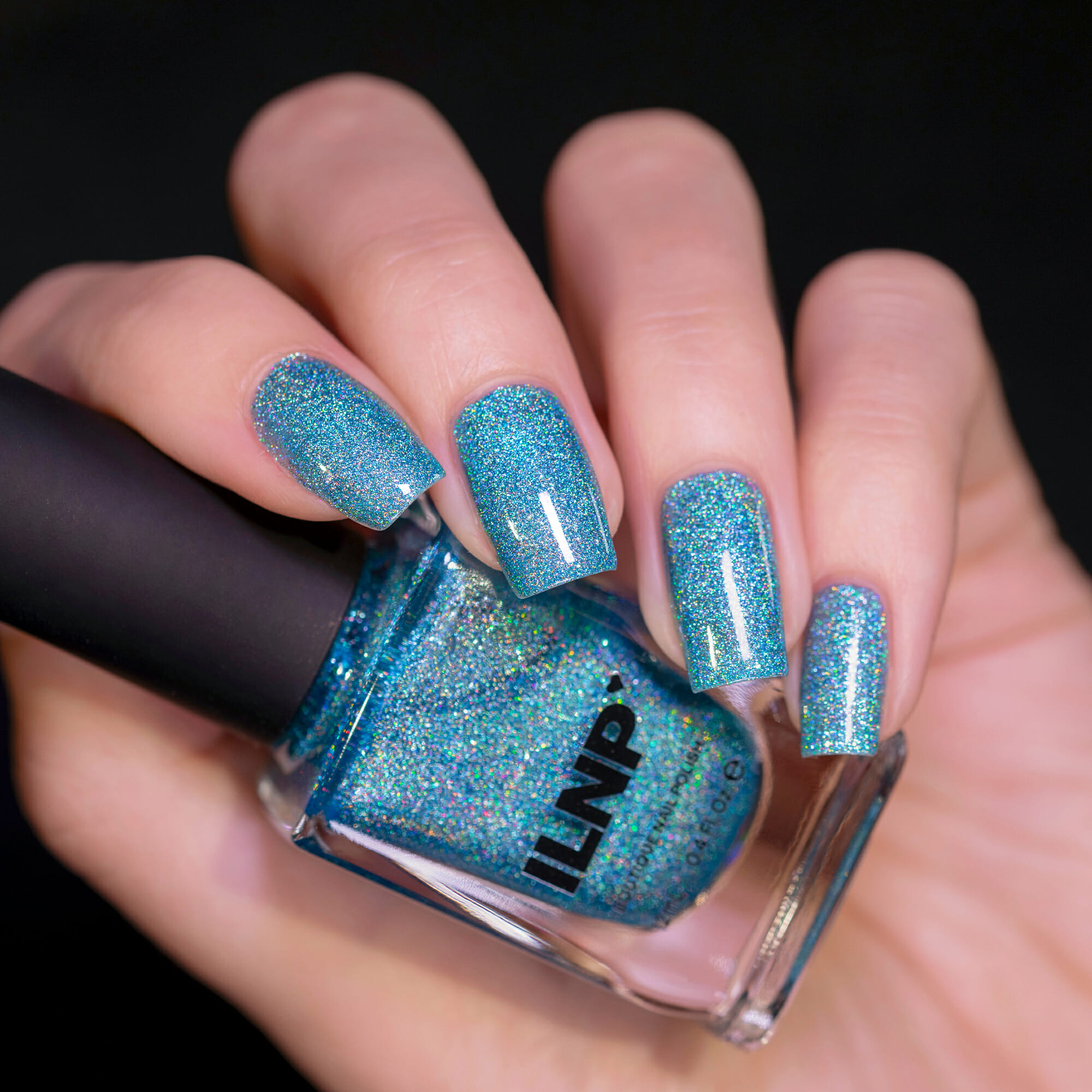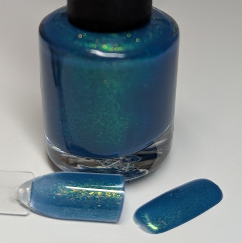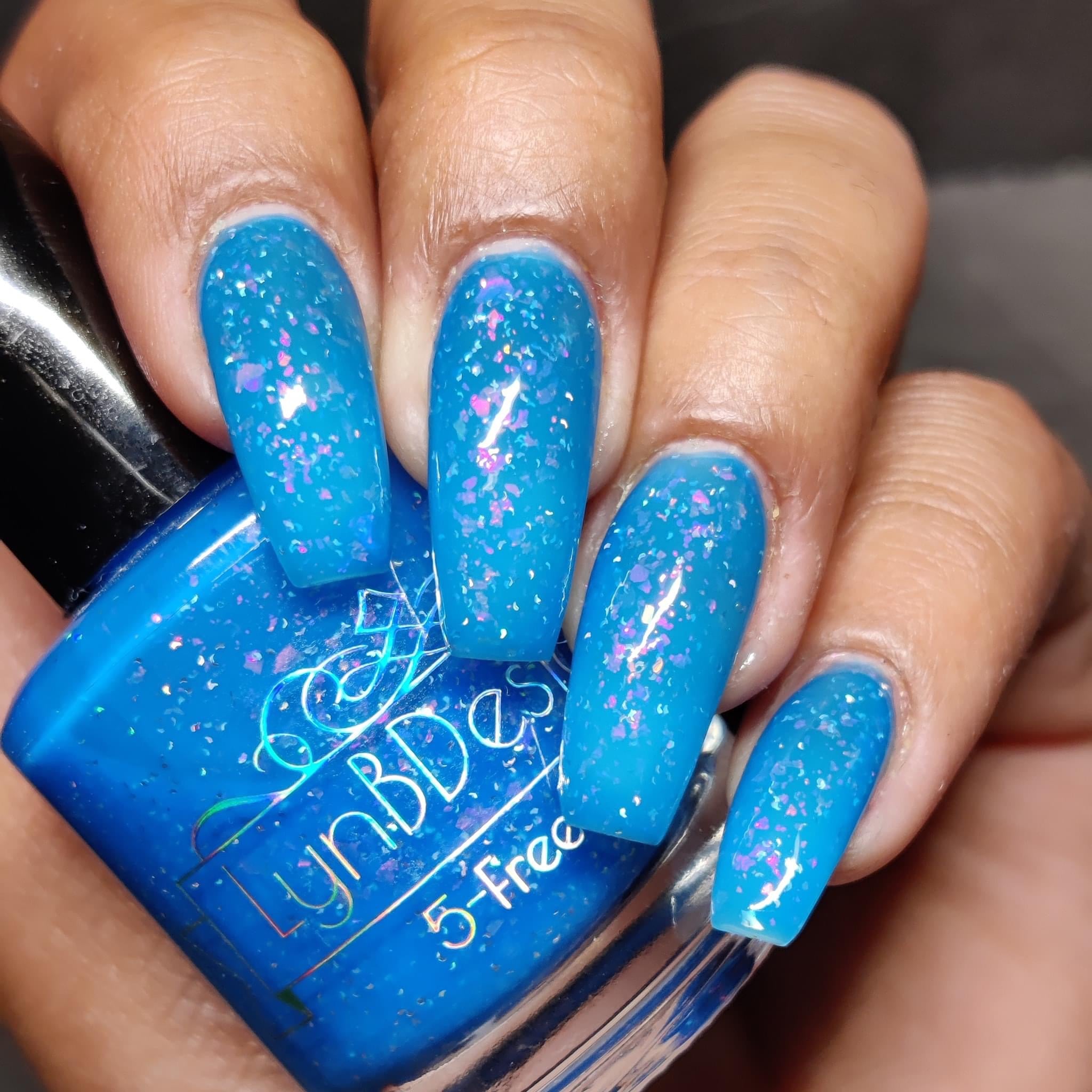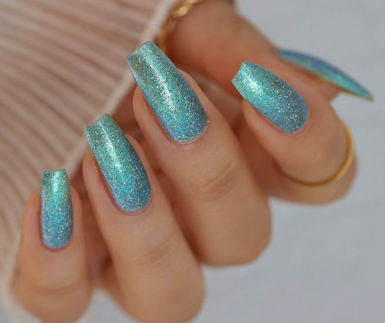 Clear base filled with holographic dust and glowy shimmer that shifts aqua/blue/indigo