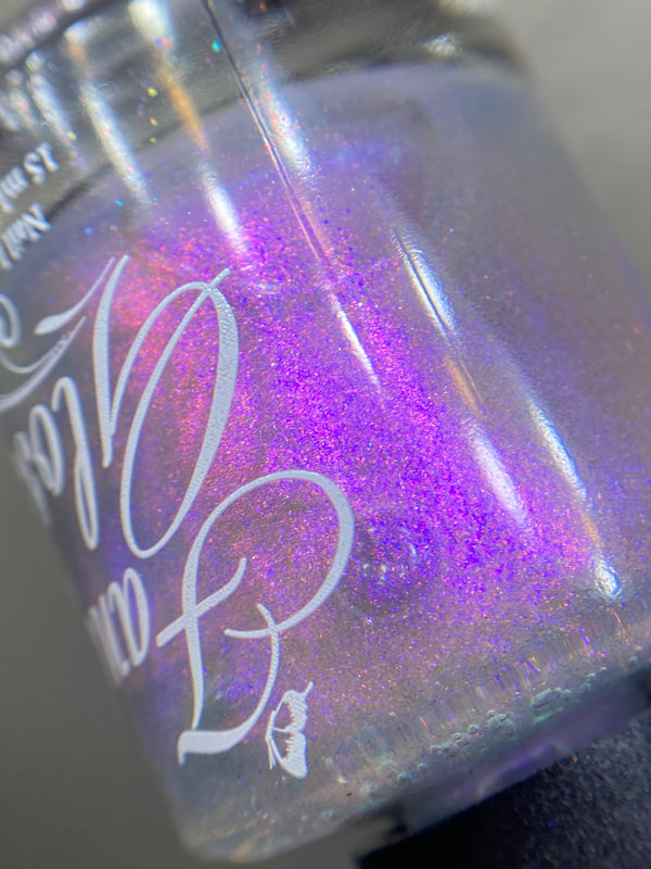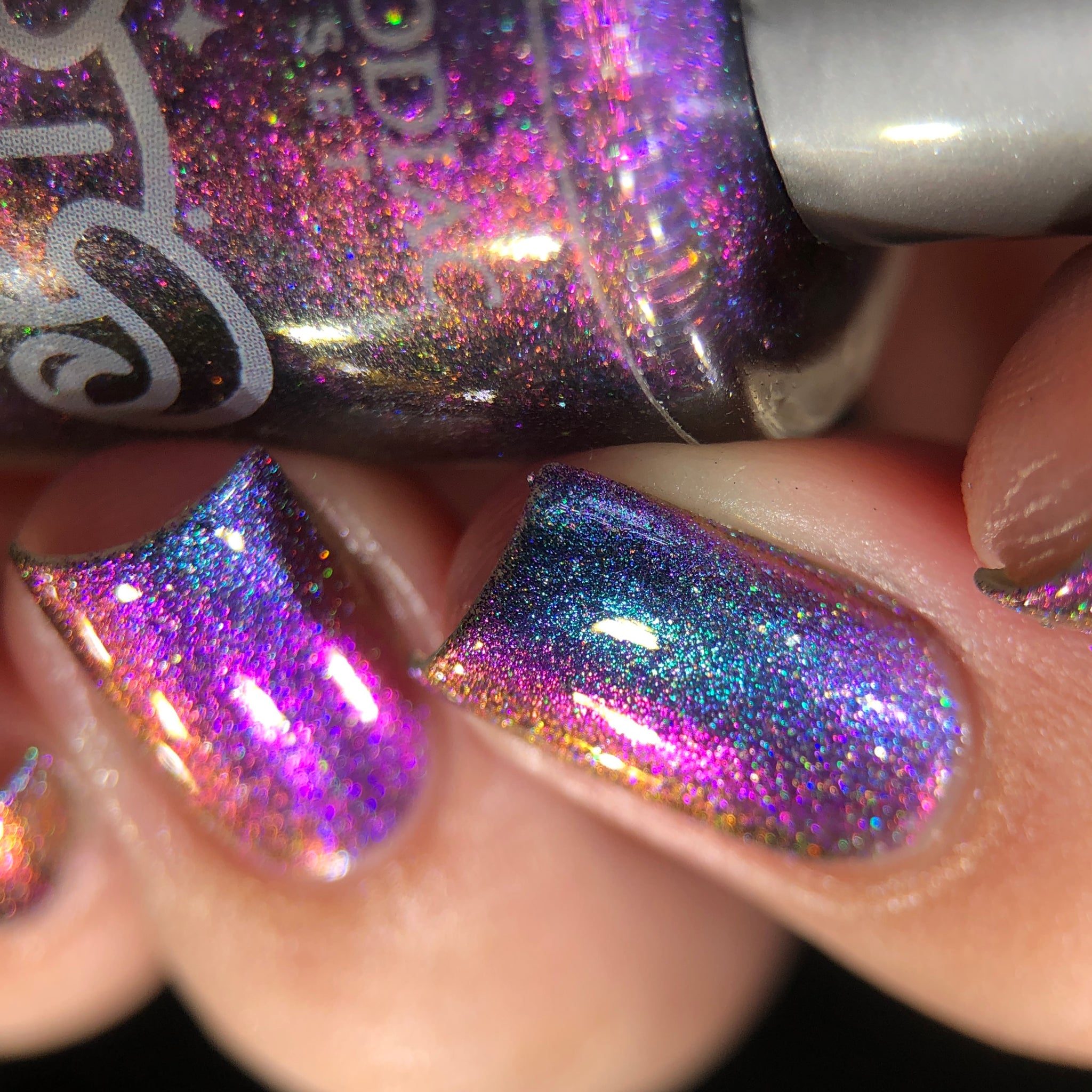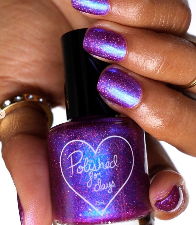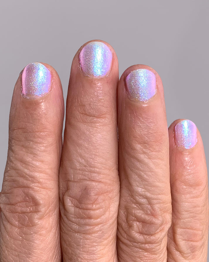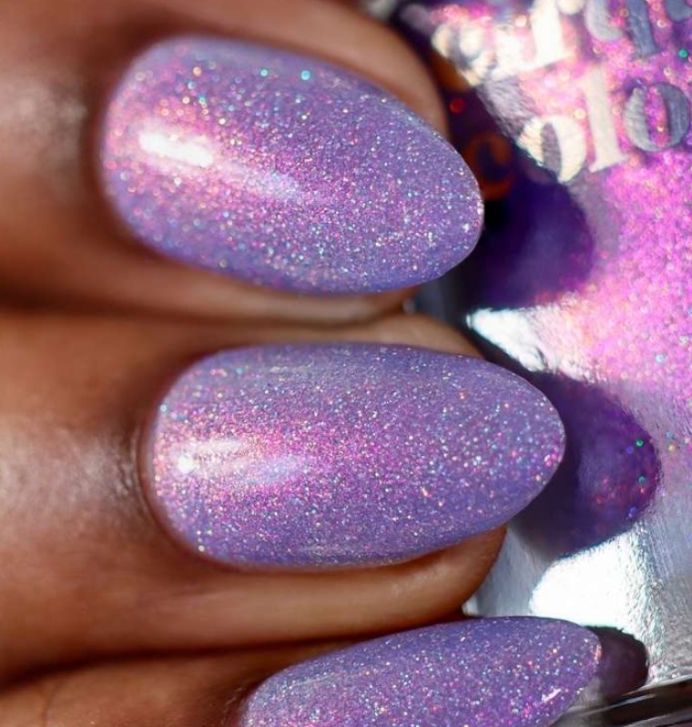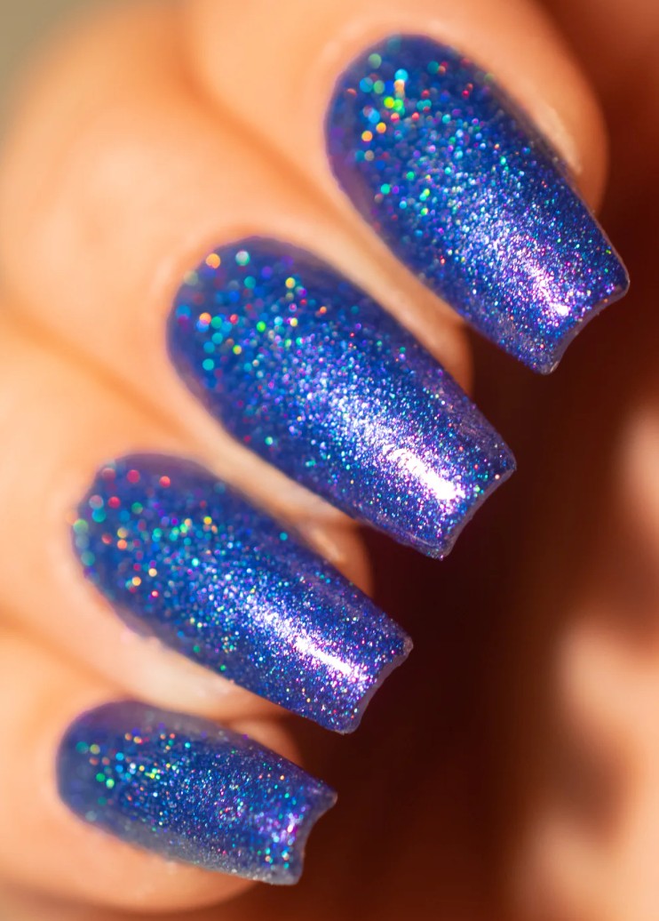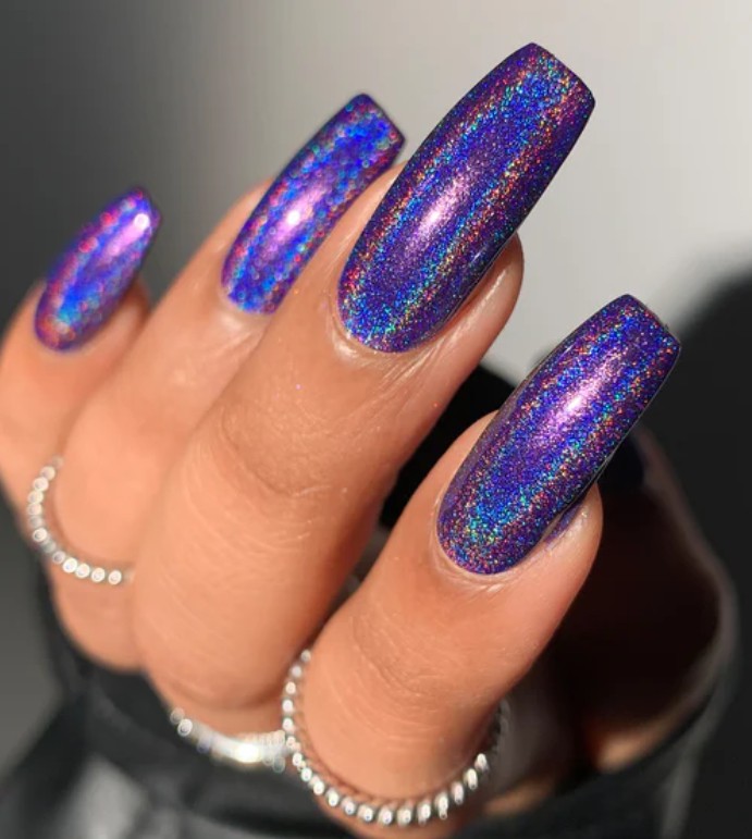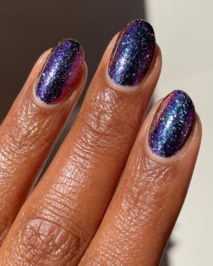 Duochrome polish filled with holographic glitter that shifts between shades of violet and blue