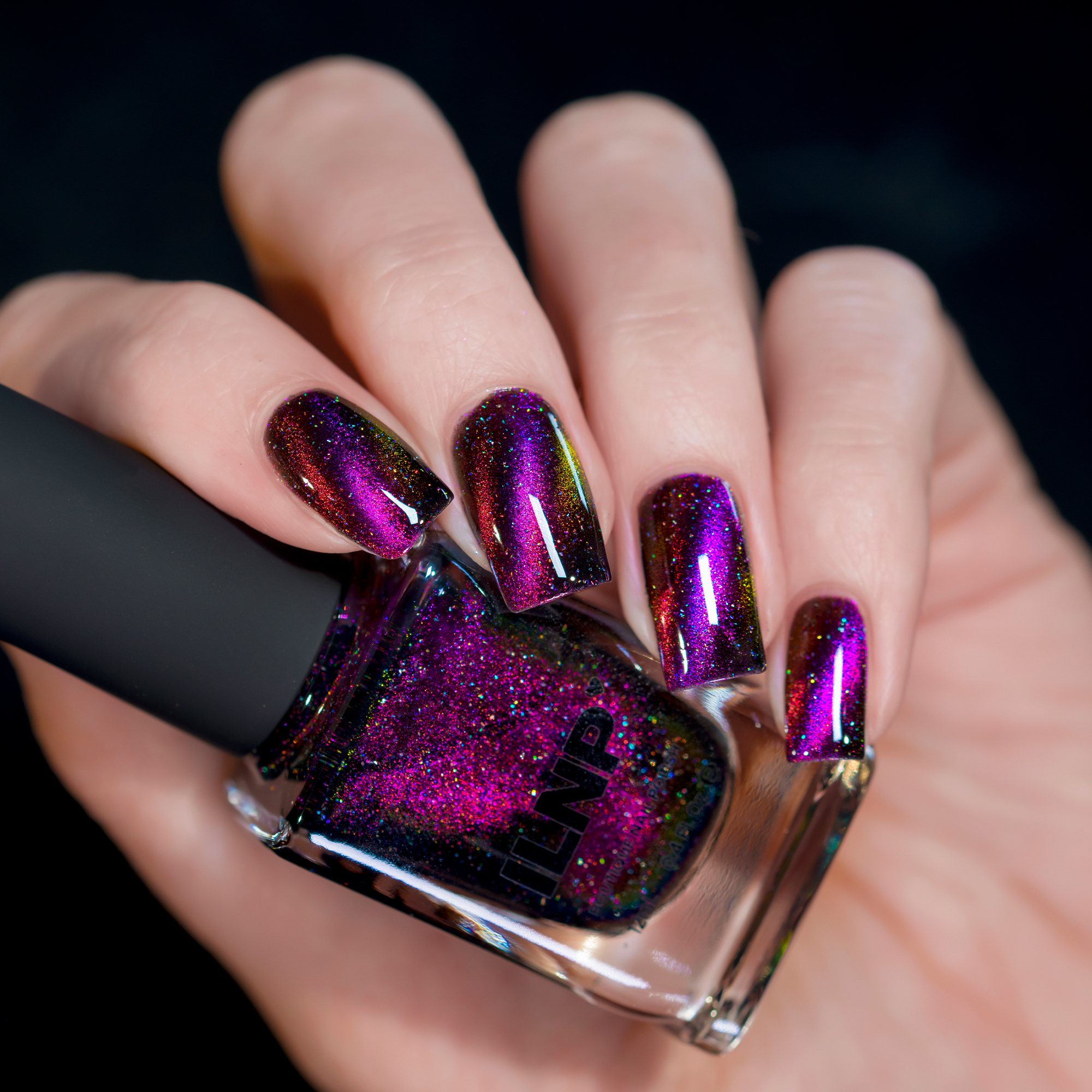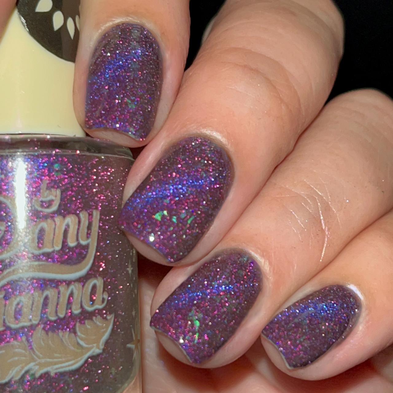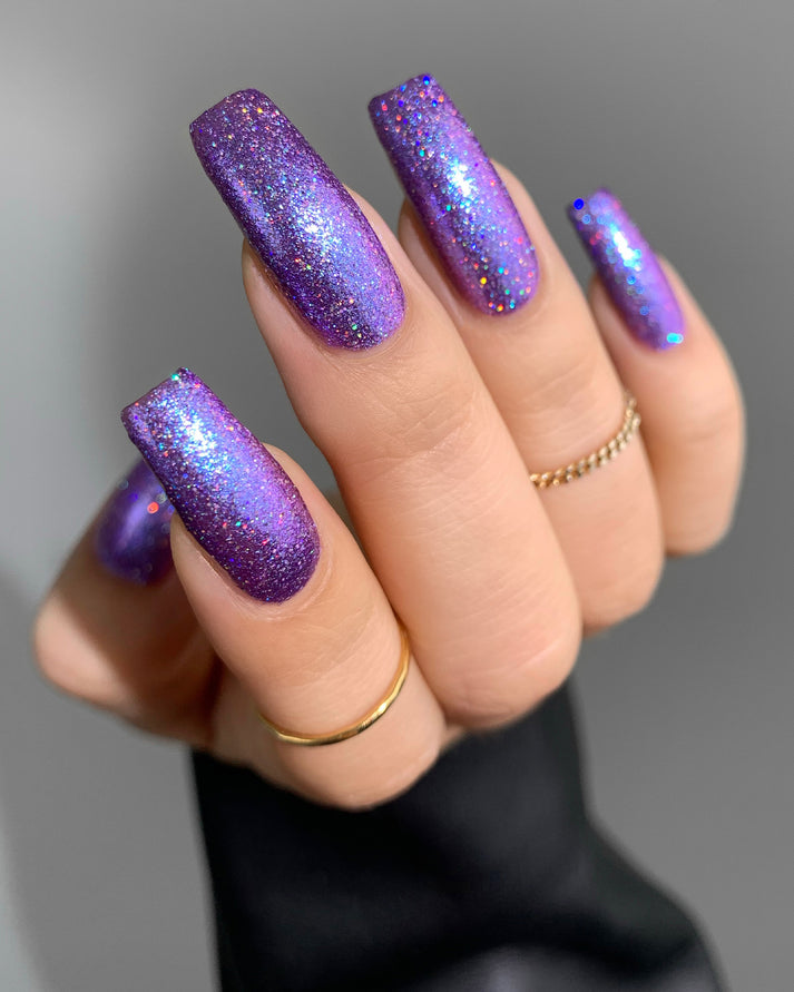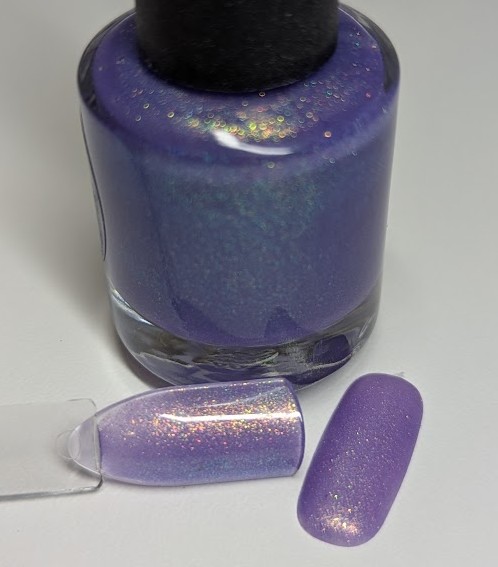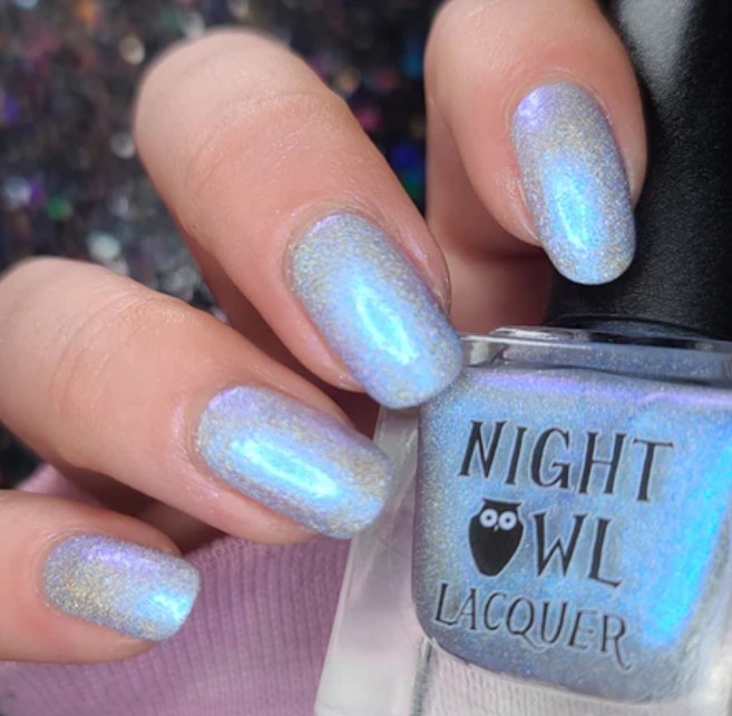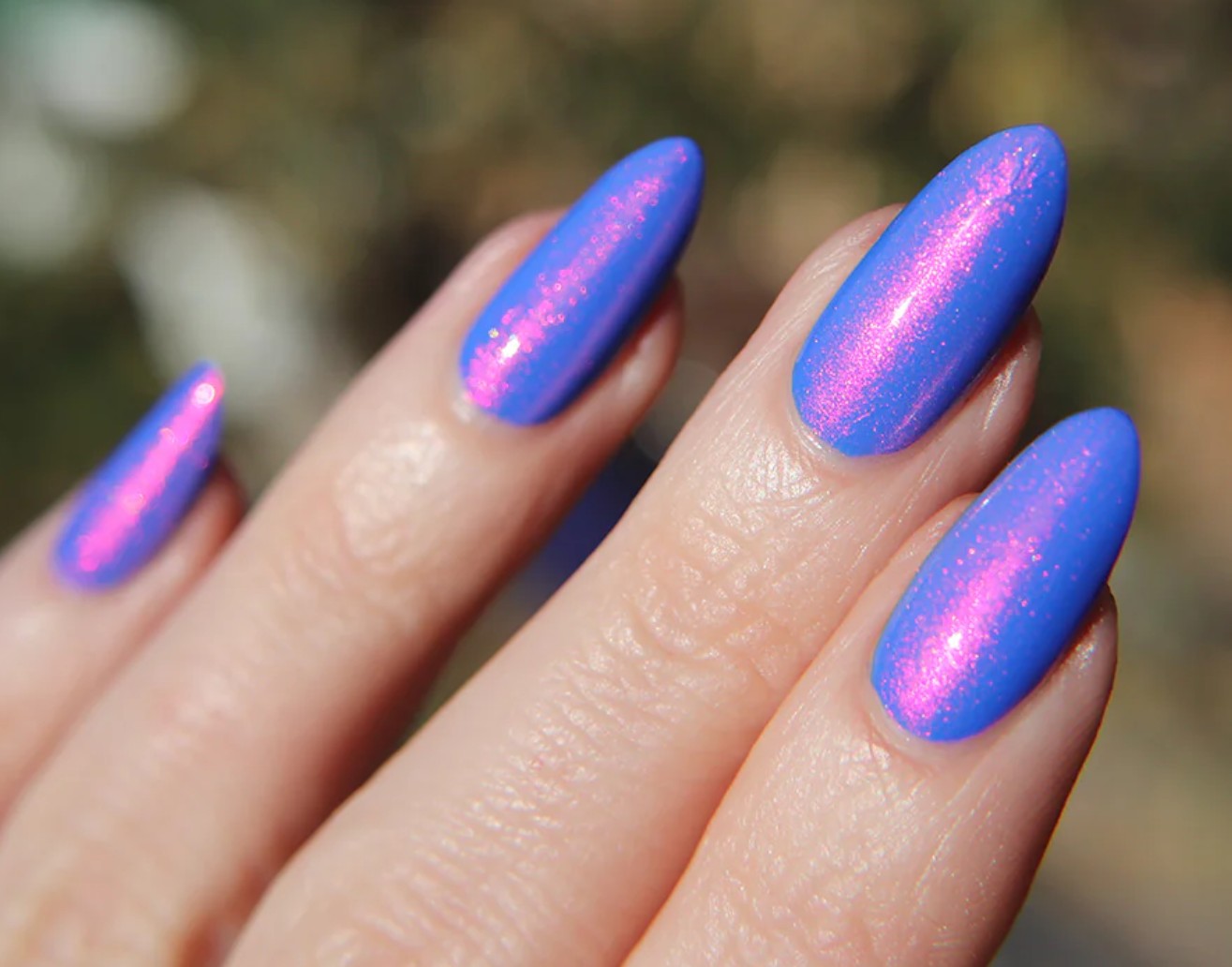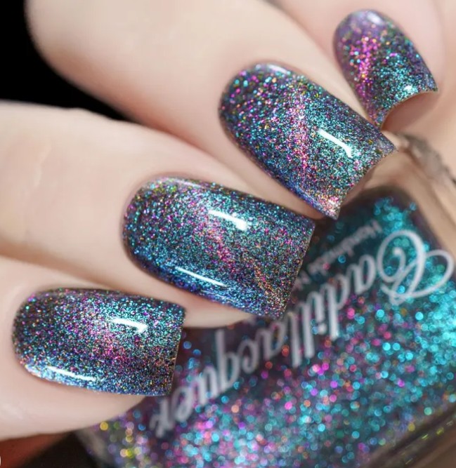 Duochrome polish filled with holographic glitter that shifts between shades of violet and blue