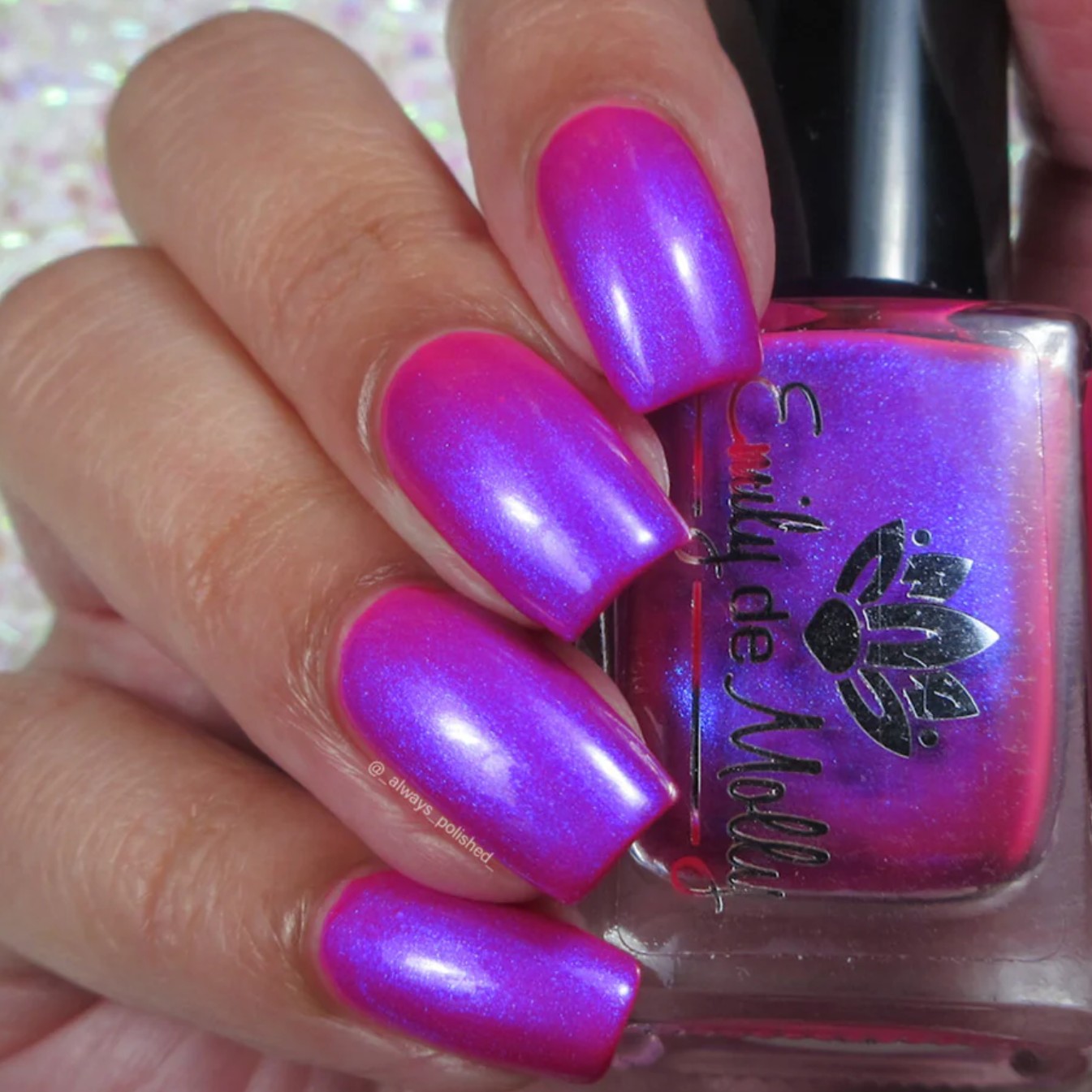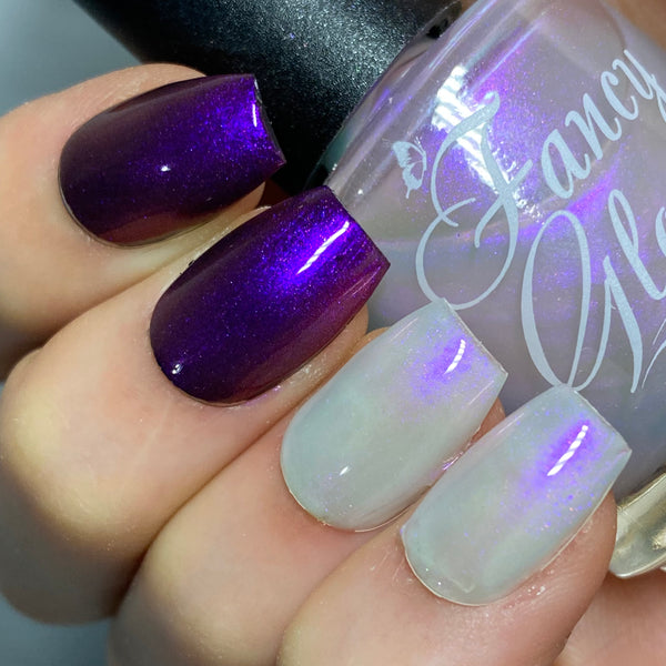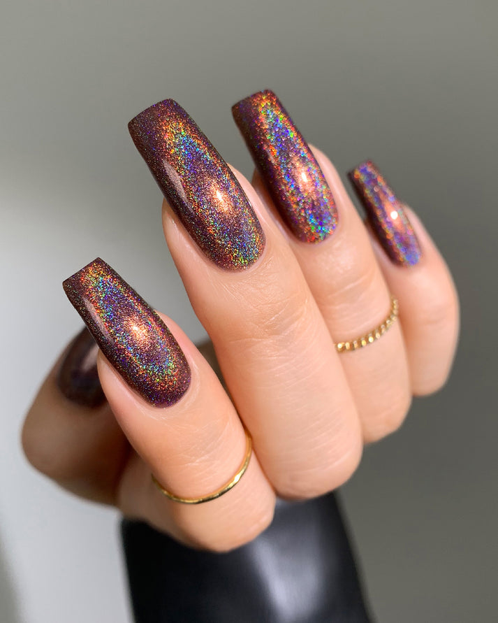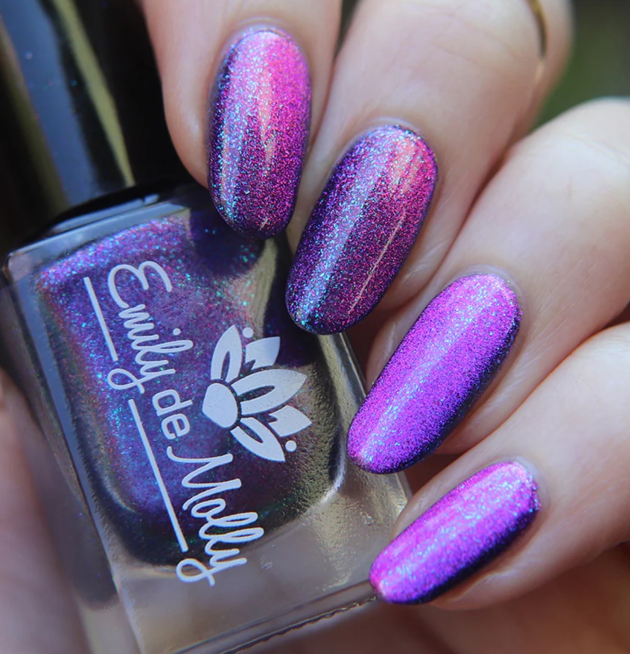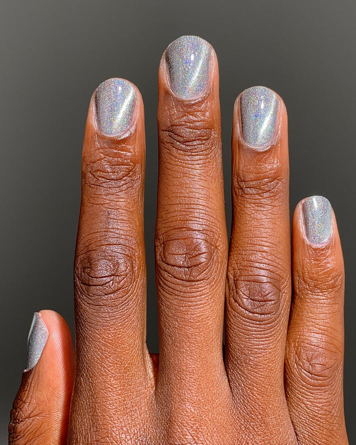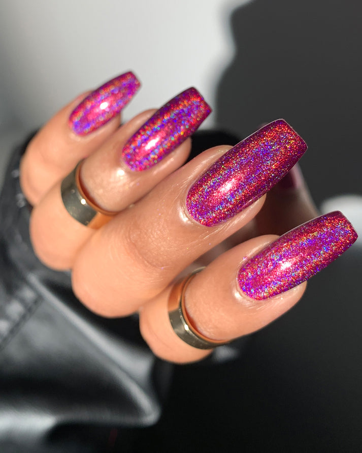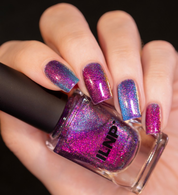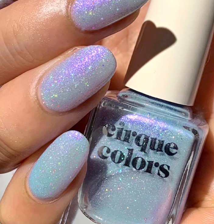 Duochrome polish filled with holographic glitter that shifts between shades of violet and blue