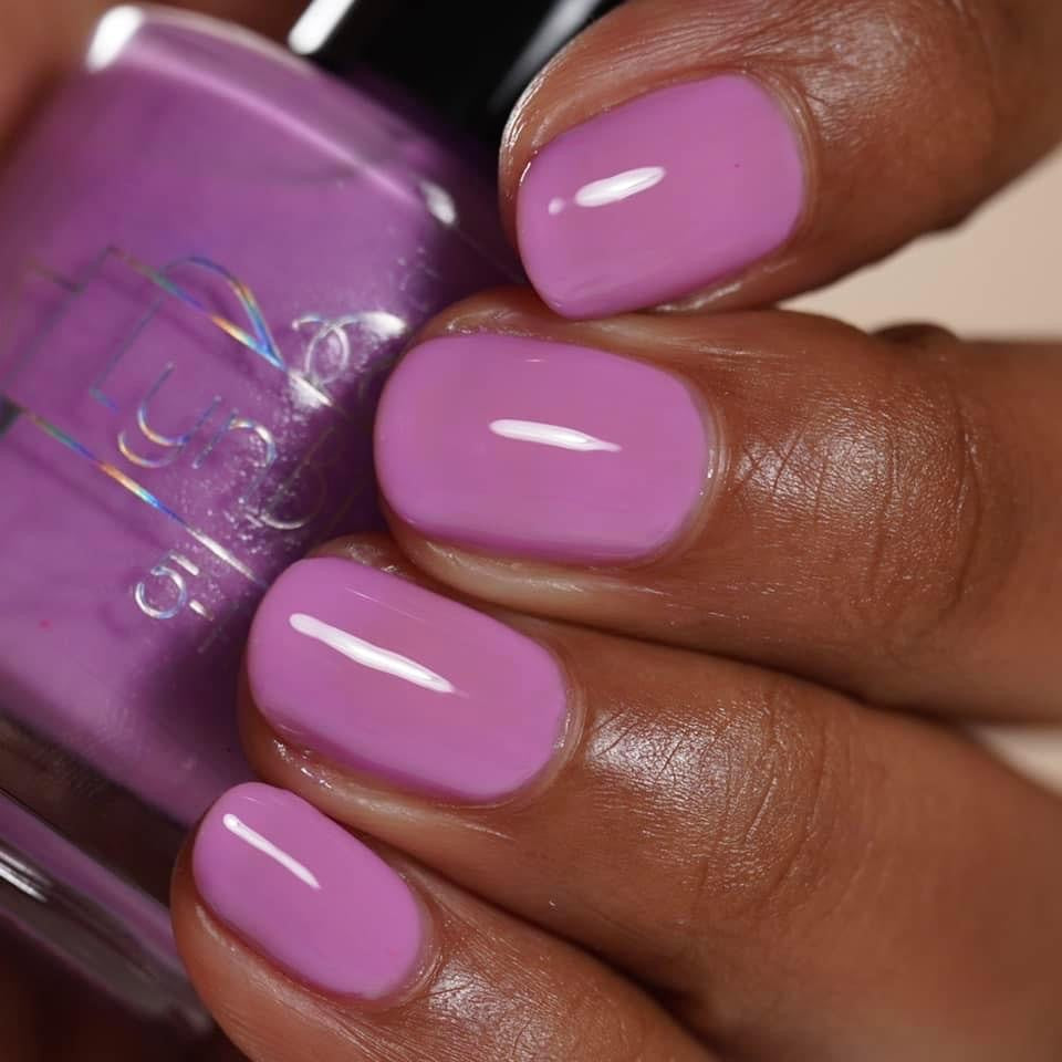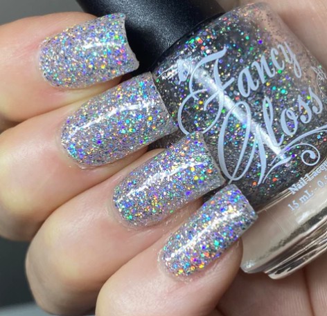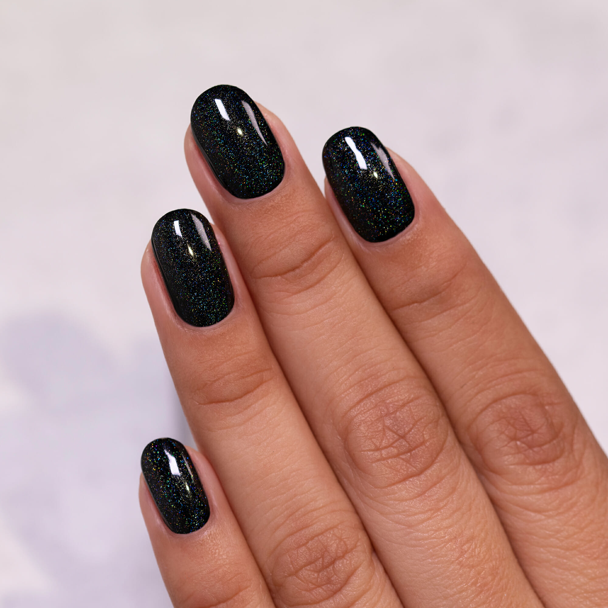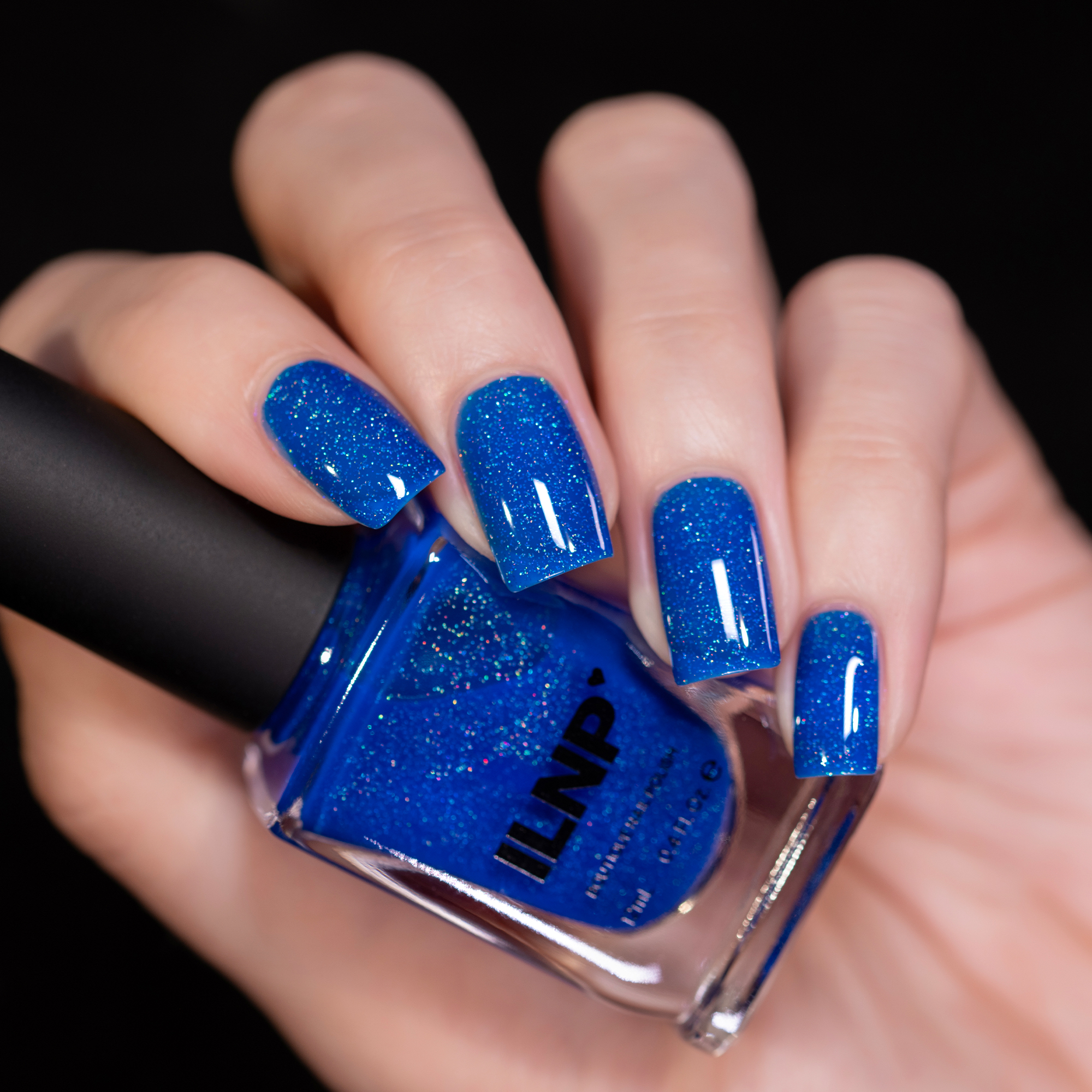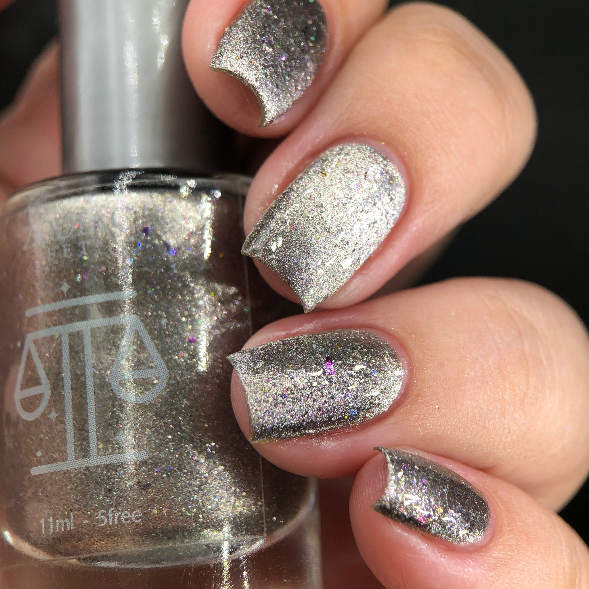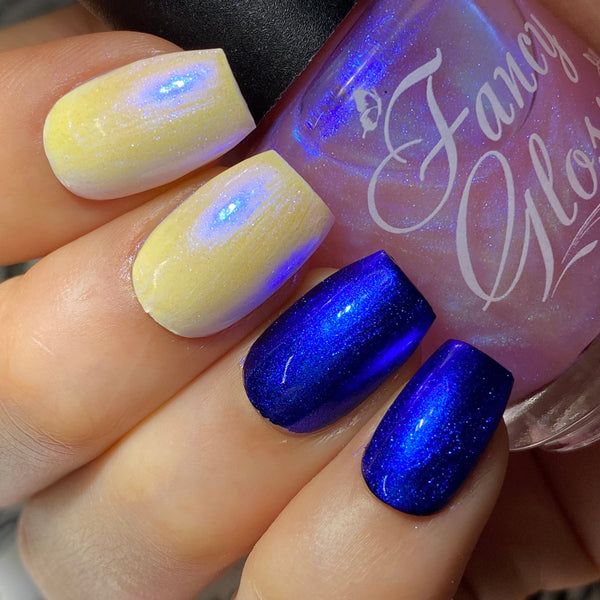Duochrome polish filled with holographic glitter that shifts between shades of violet and blue