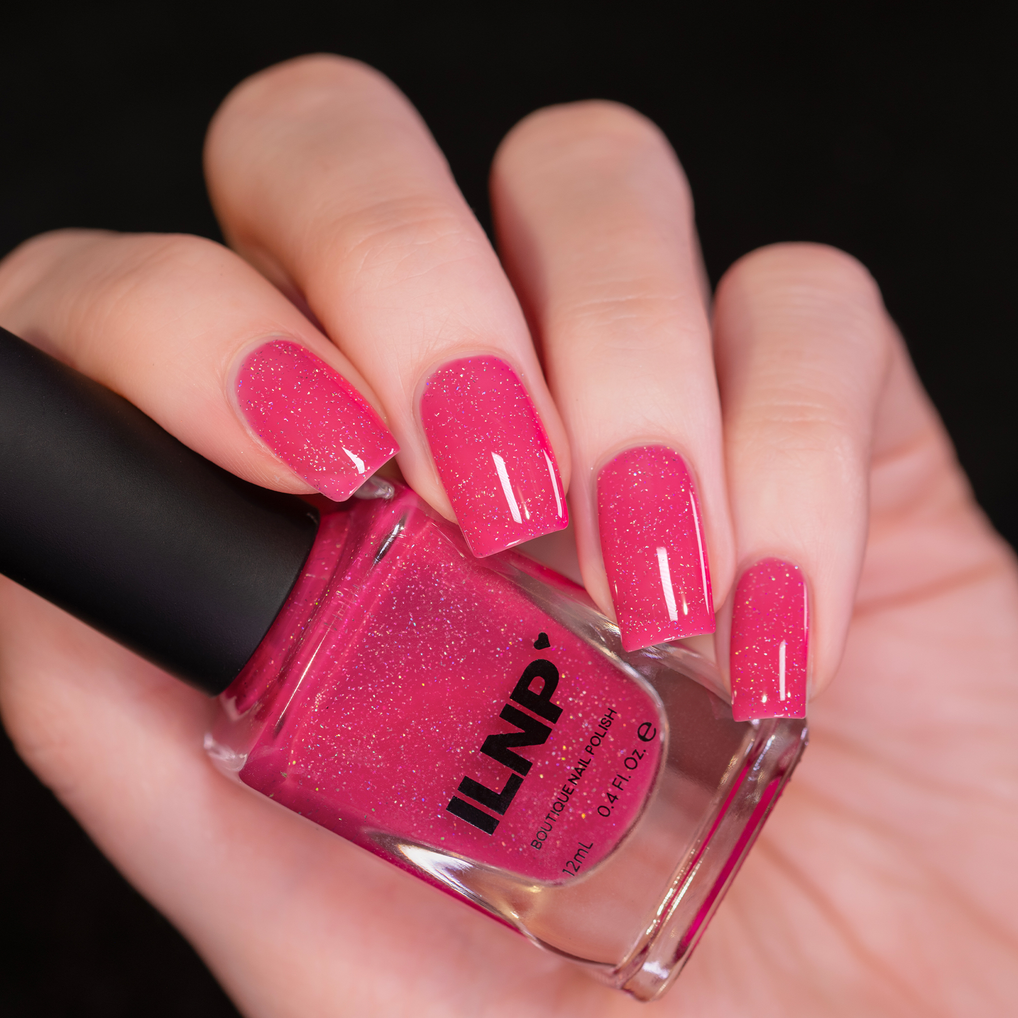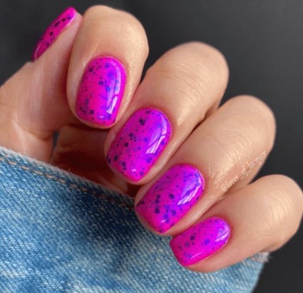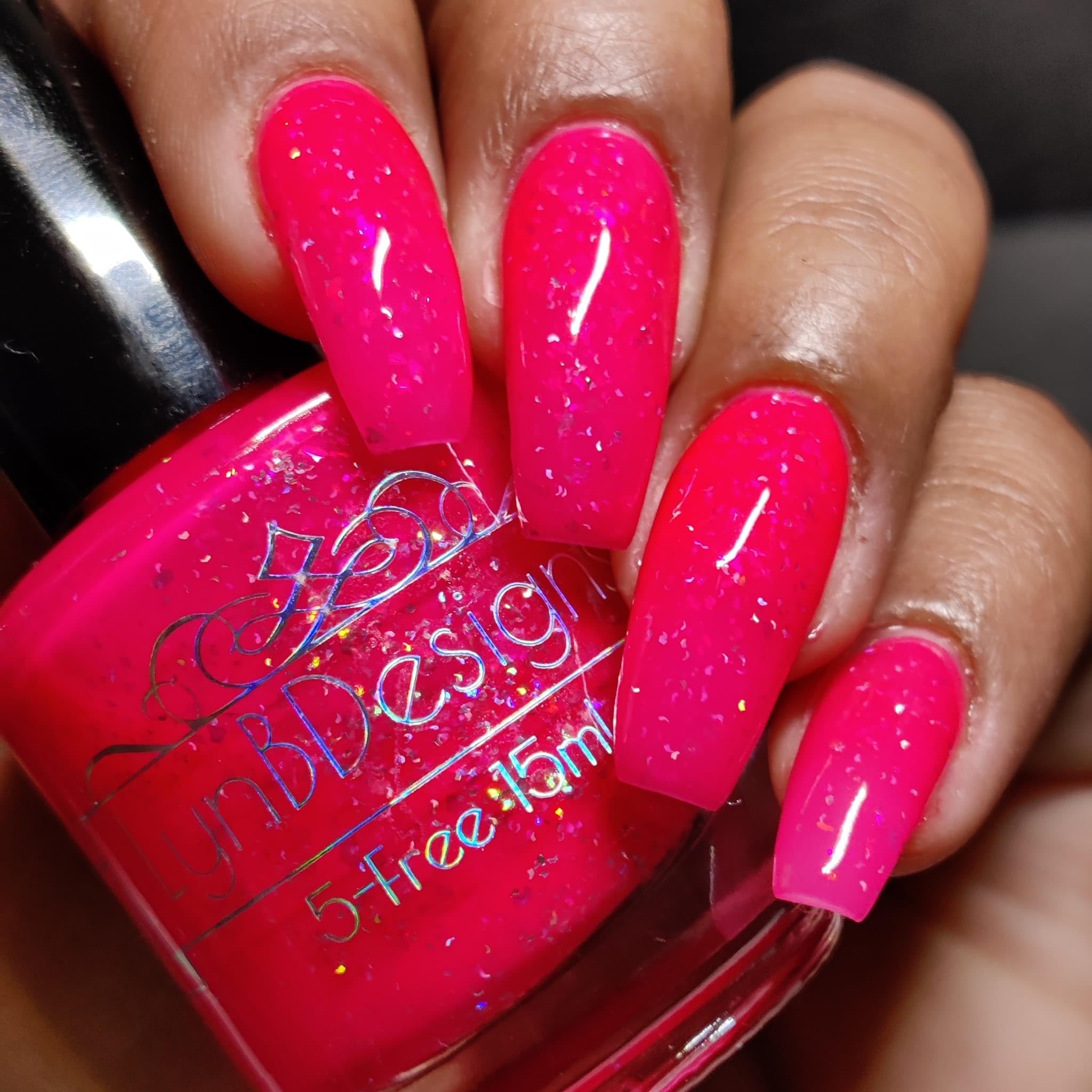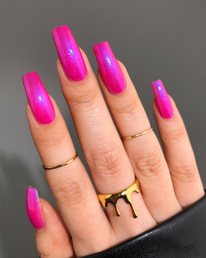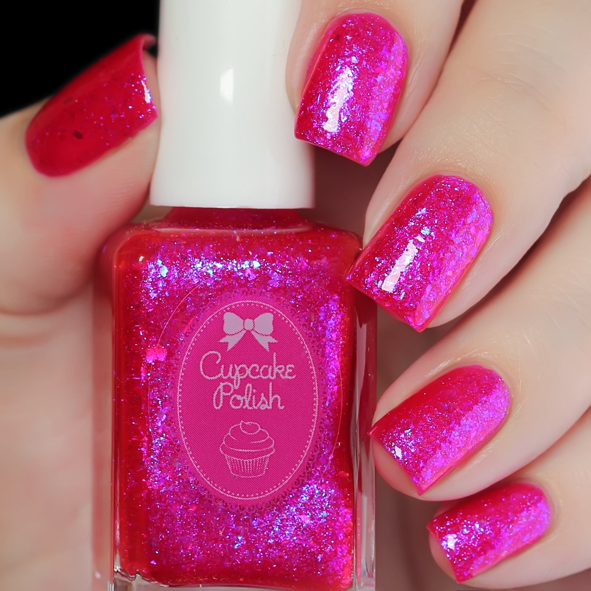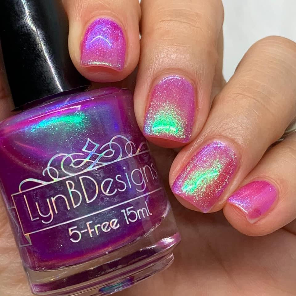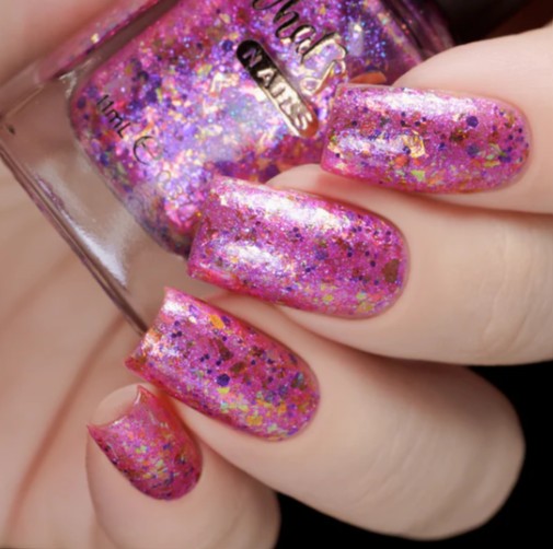 Hot pink packed with blue to purple iridescent shimmer, orange to green and gold to green flakies, and purple hex glitters in two sizes