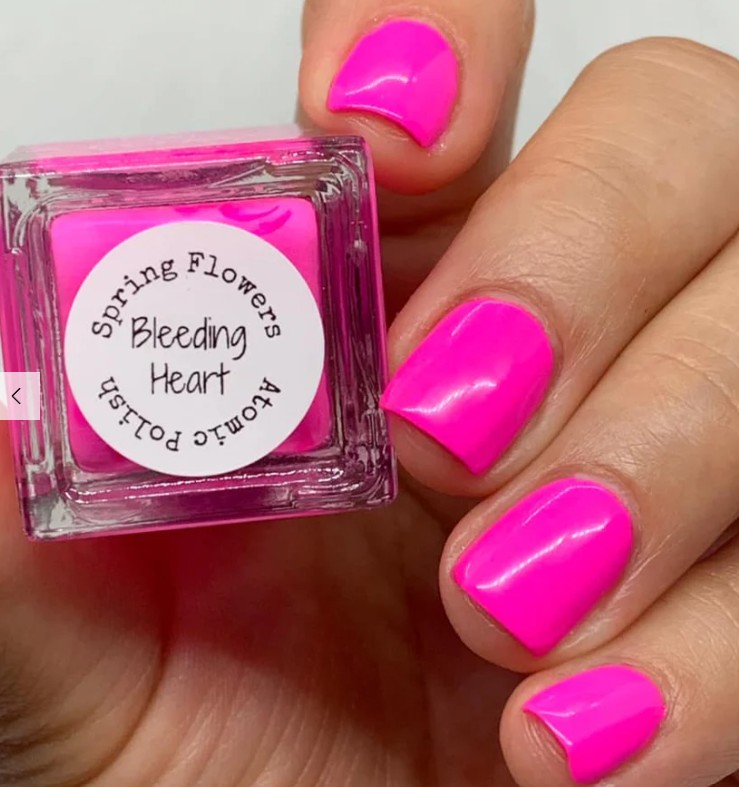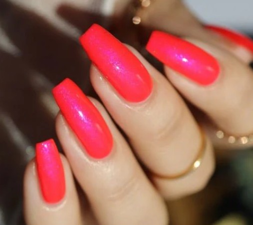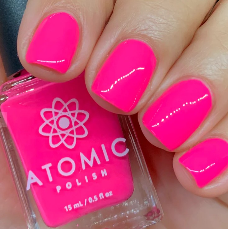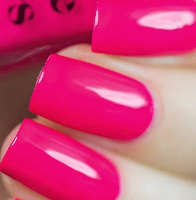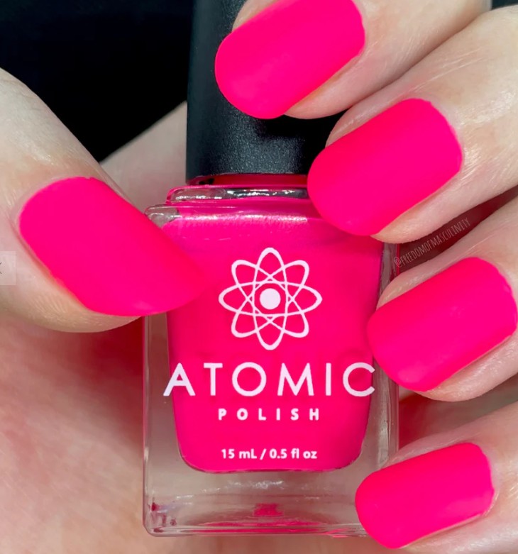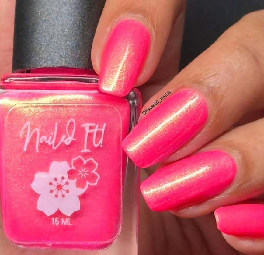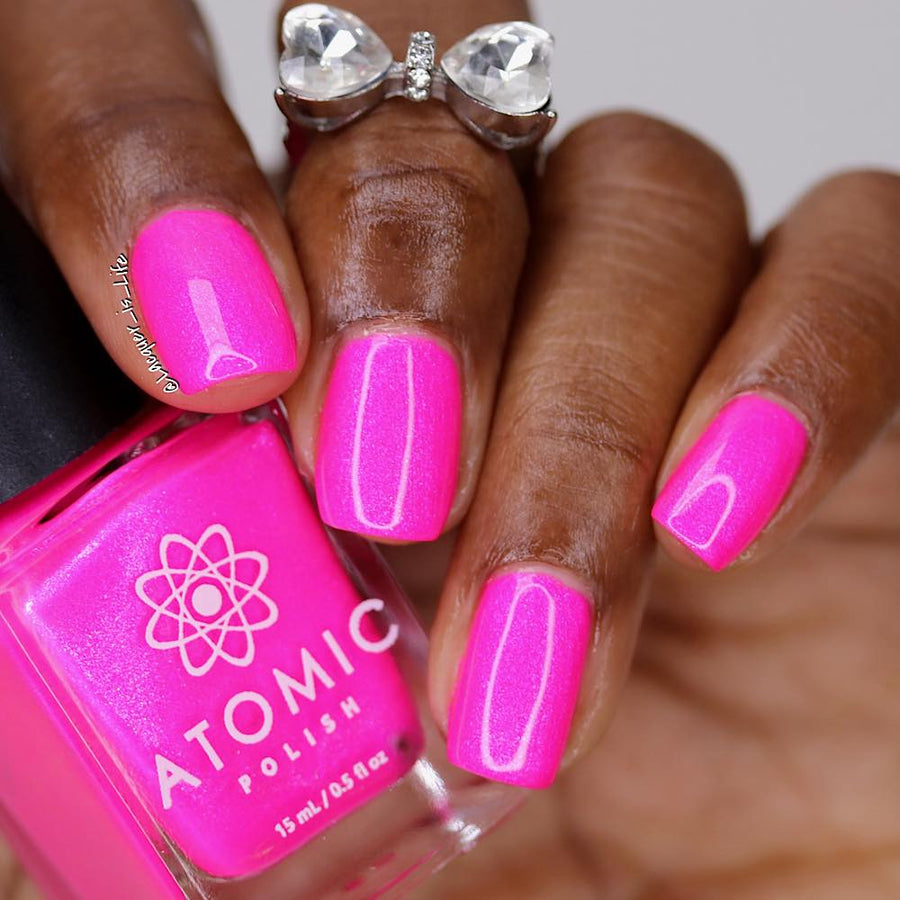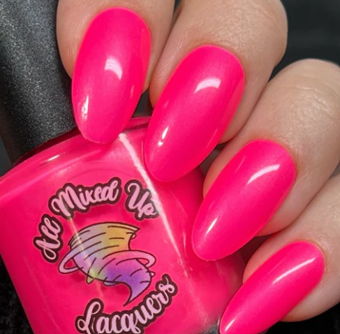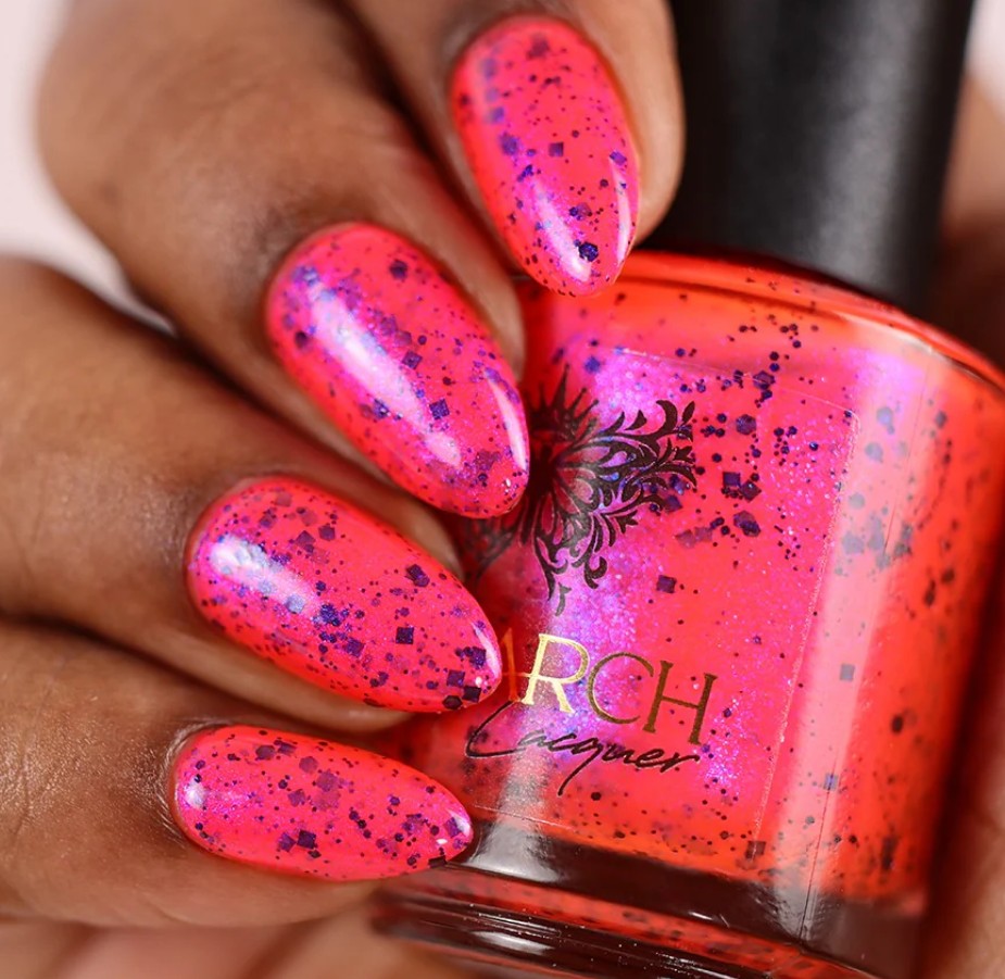 Hot pink packed with blue to purple iridescent shimmer, orange to green and gold to green flakies, and purple hex glitters in two sizes
