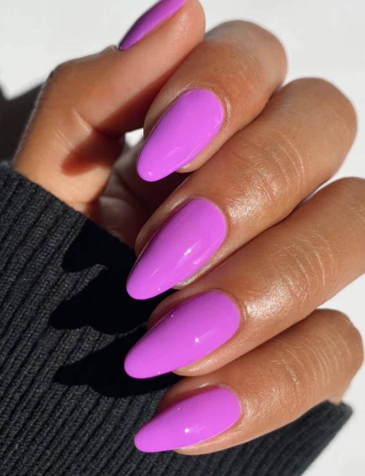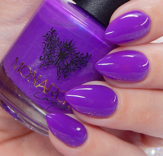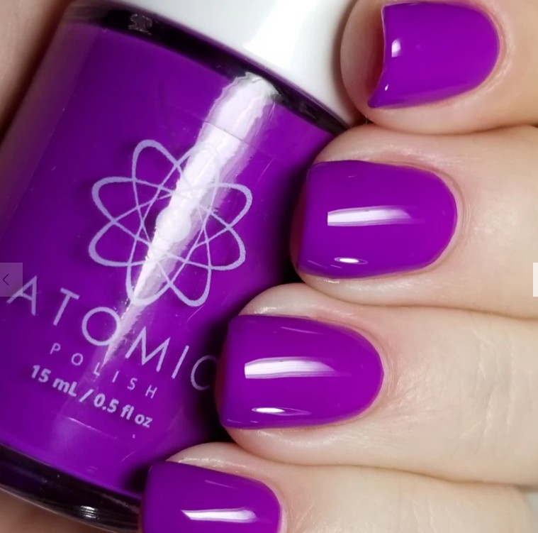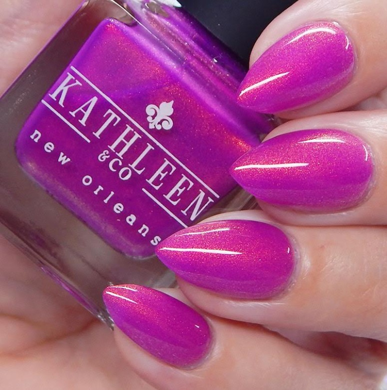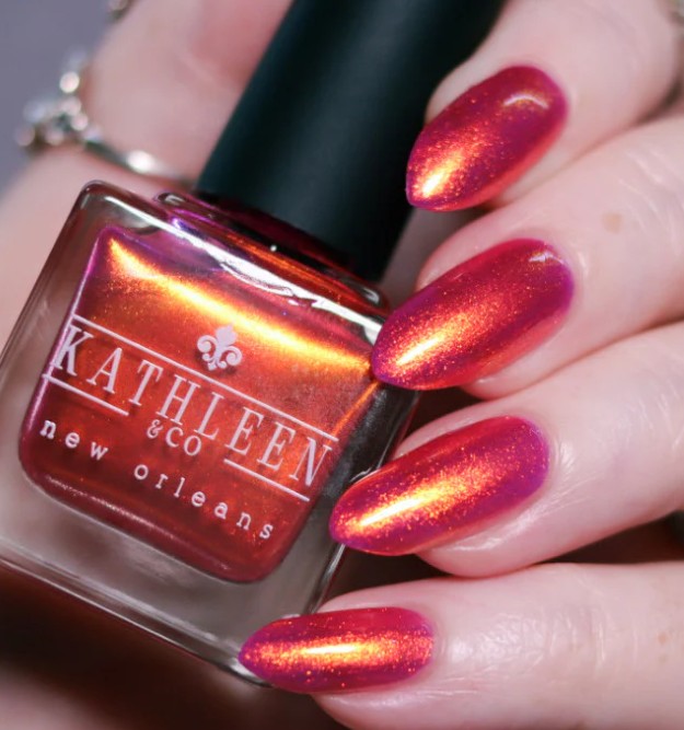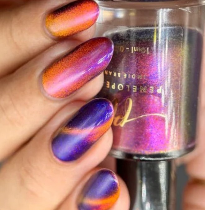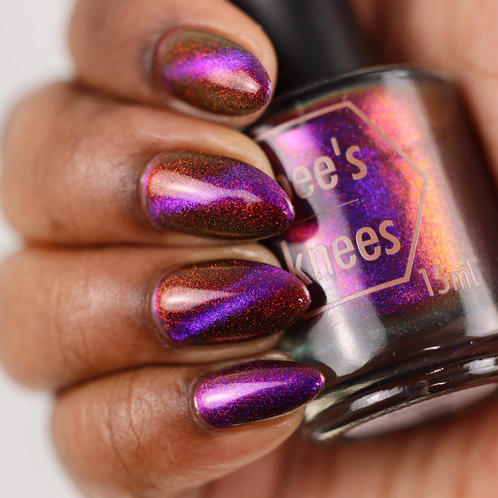 Purple base with green to purple magnetic flakies and a blend of orange to green and pink to green iridescent flakes