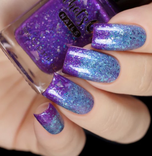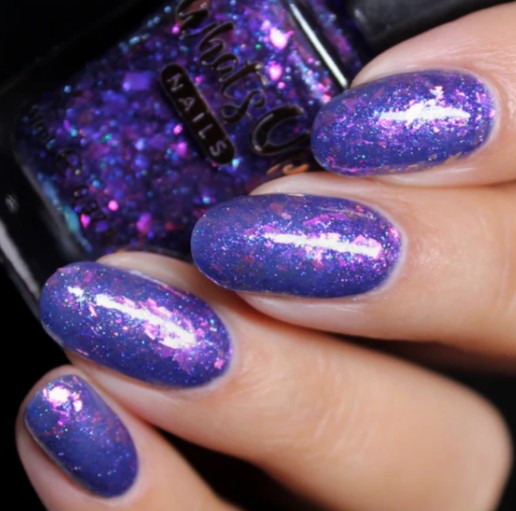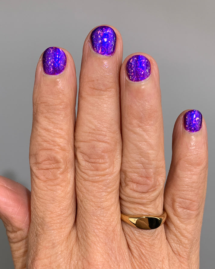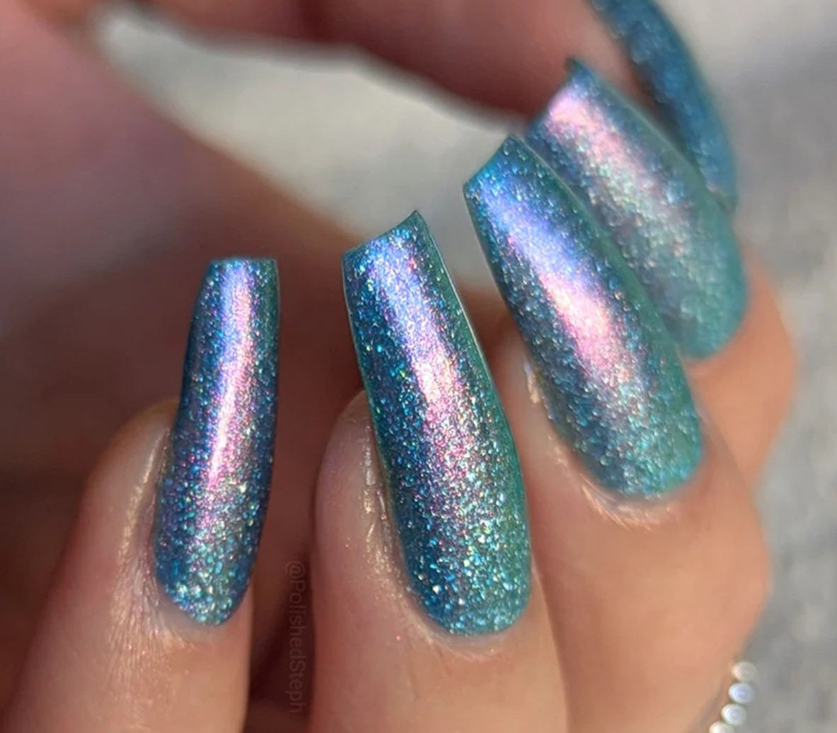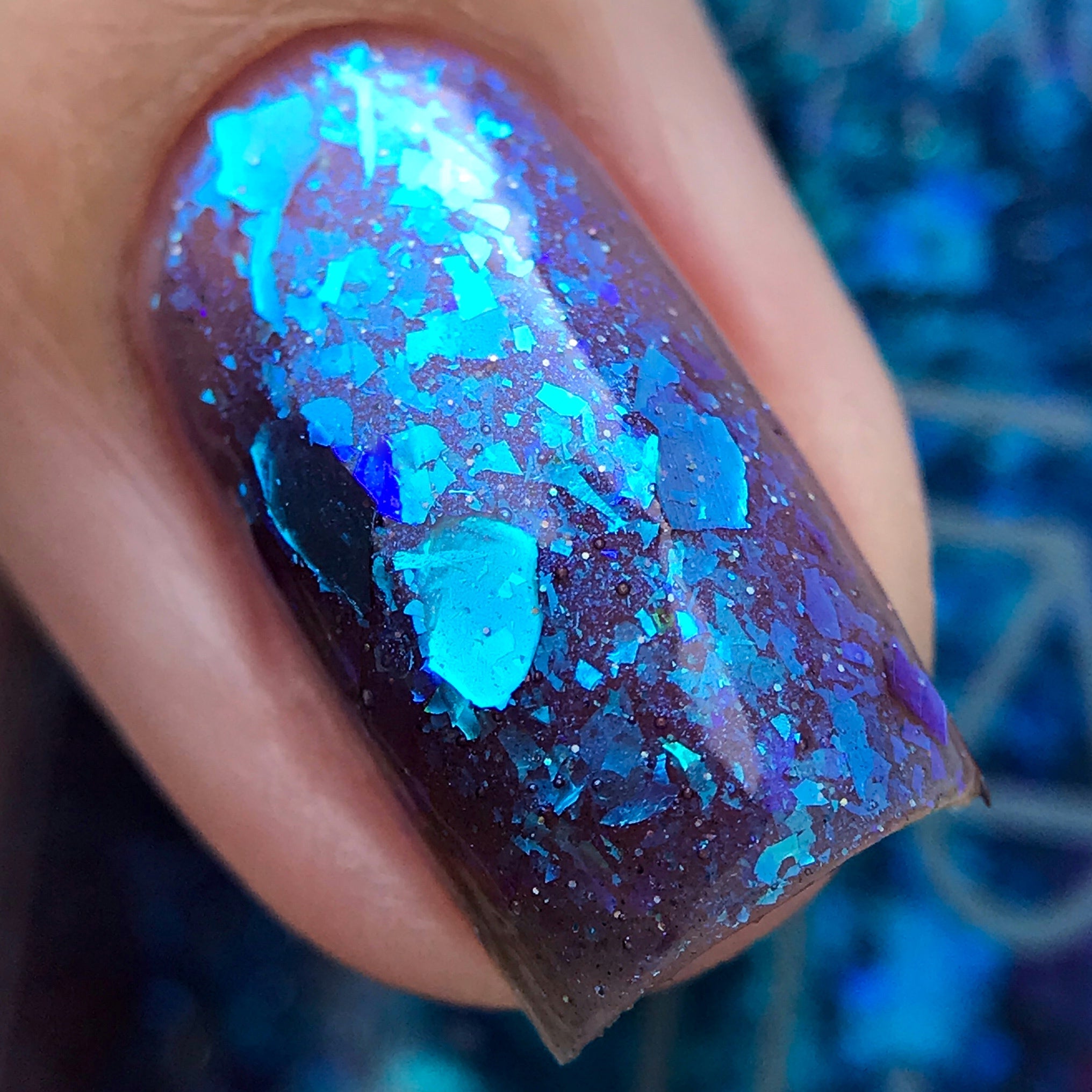 Multichrome flakie filled with holographic glitter that shifts between shades of blue and purple