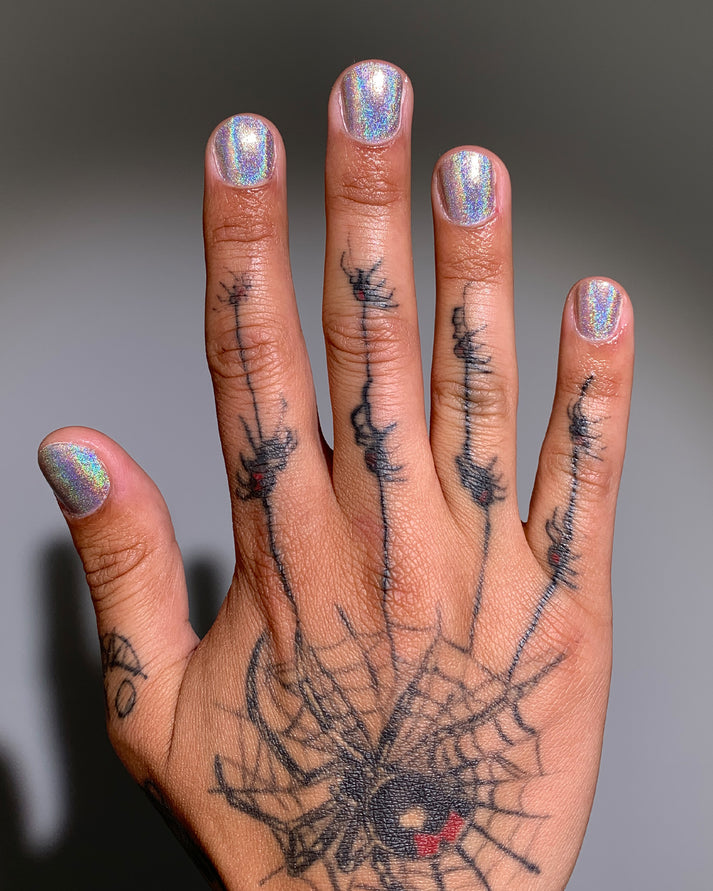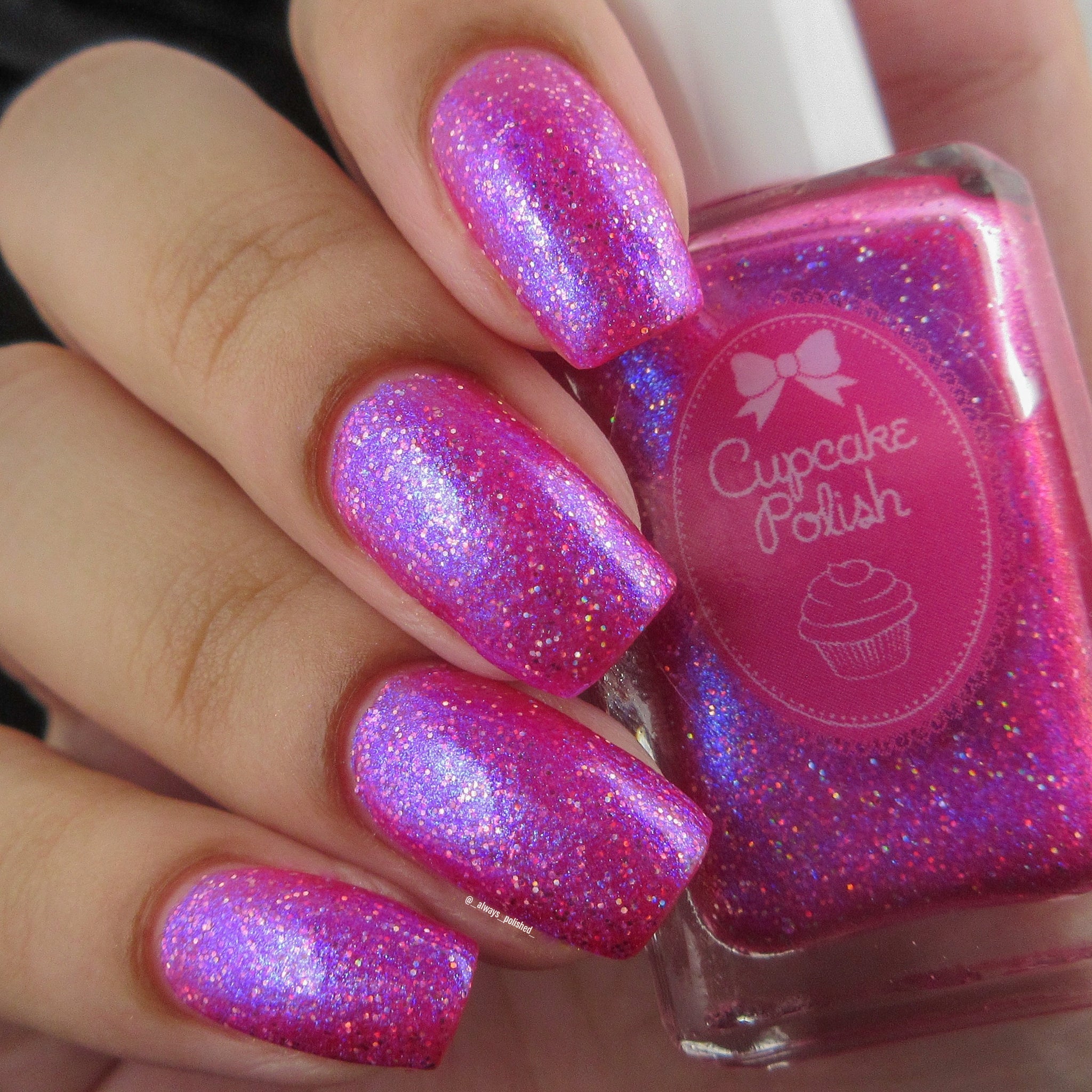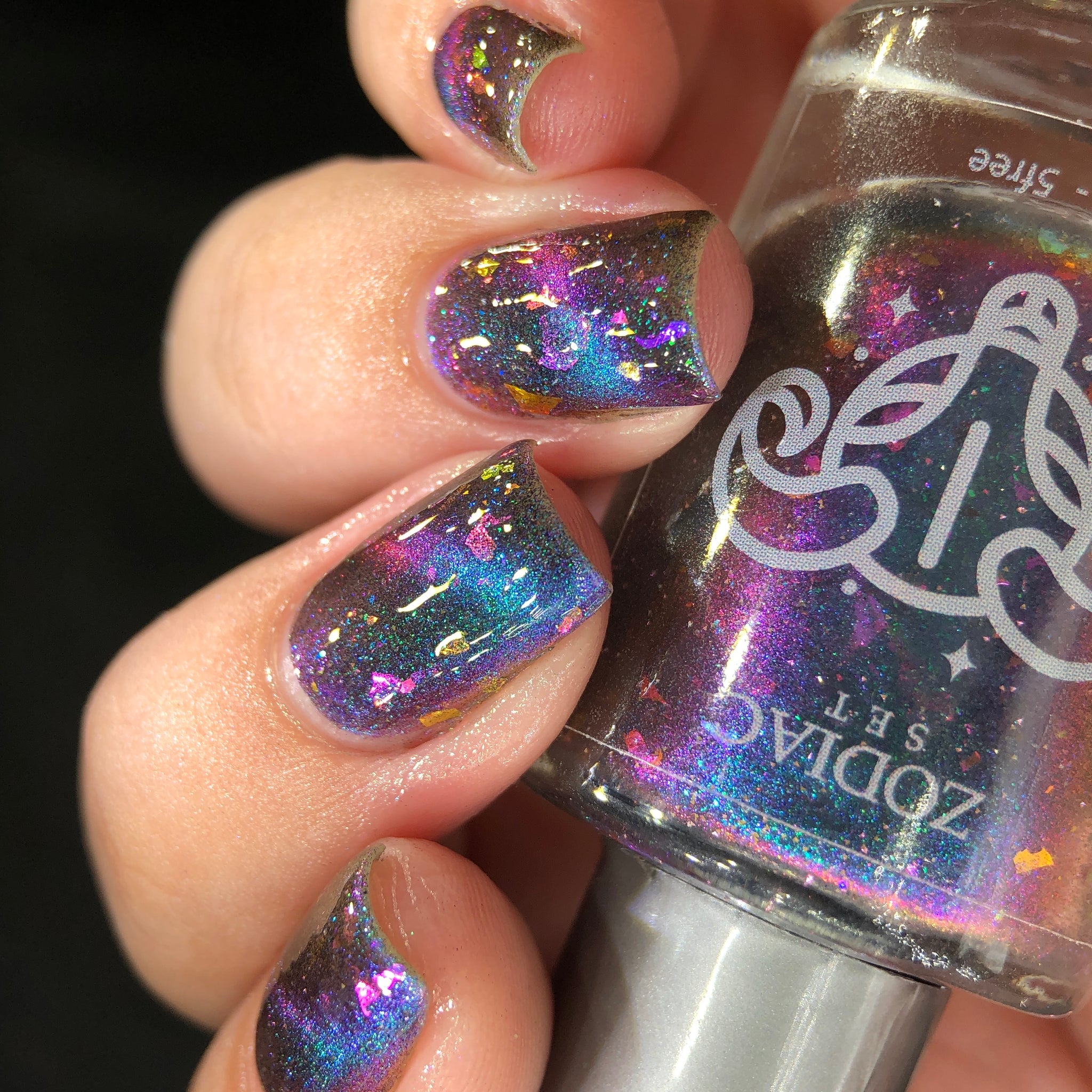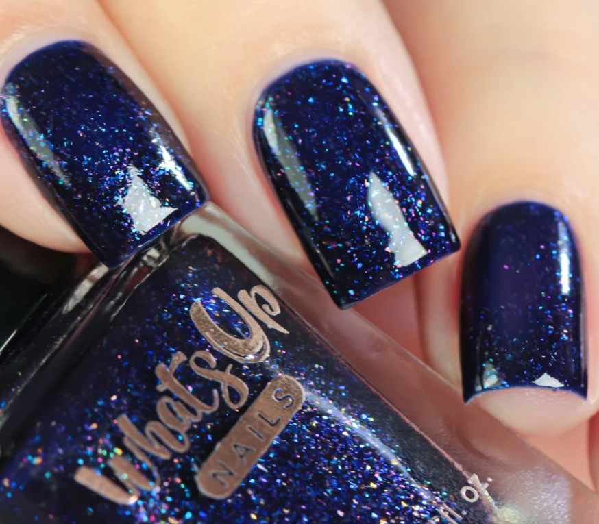 Multichrome flakie filled with holographic glitter that shifts between shades of blue and purple