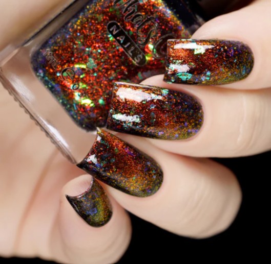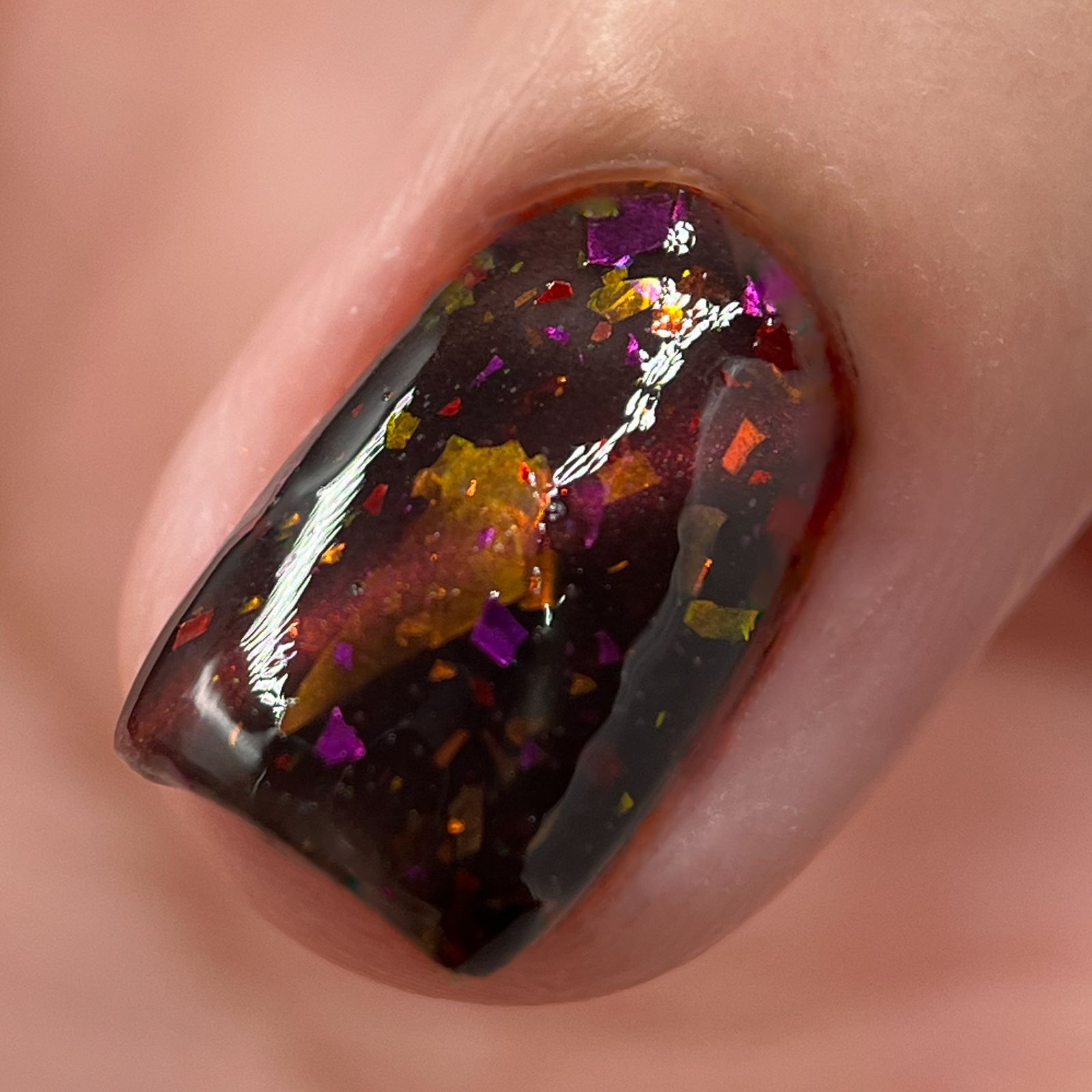 Dark mauve base with orange to green iridescent flakies and blue to purple shimmer