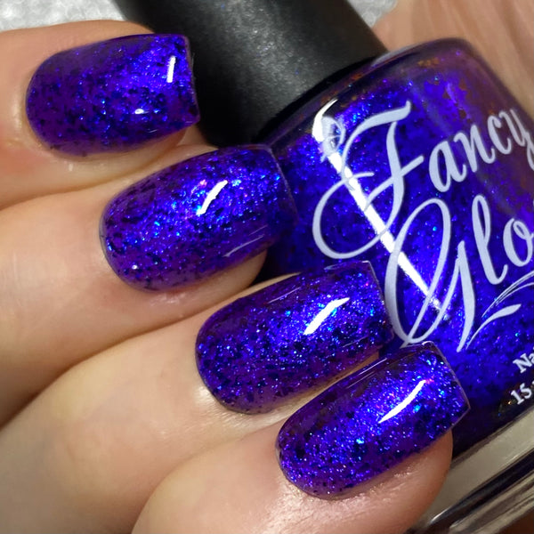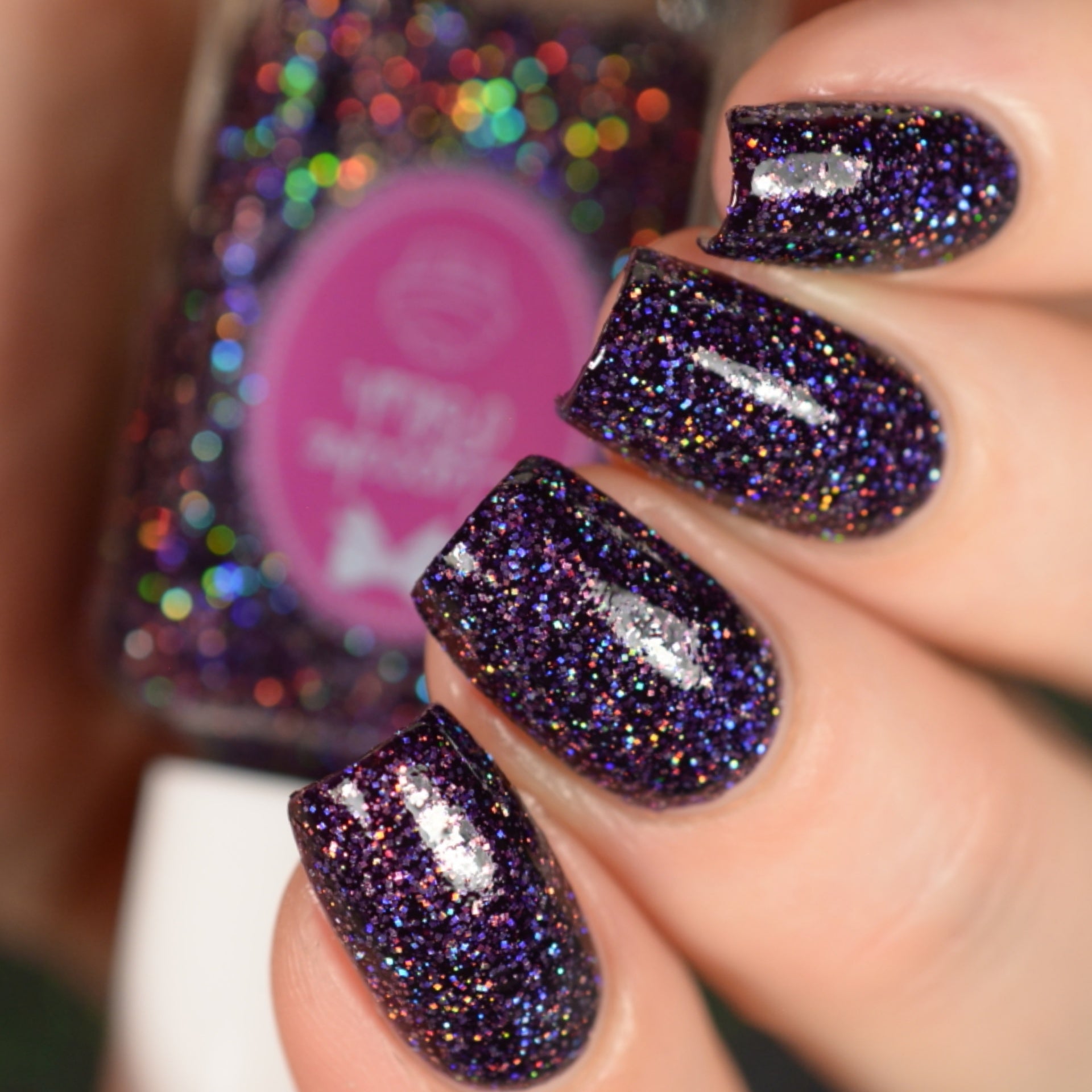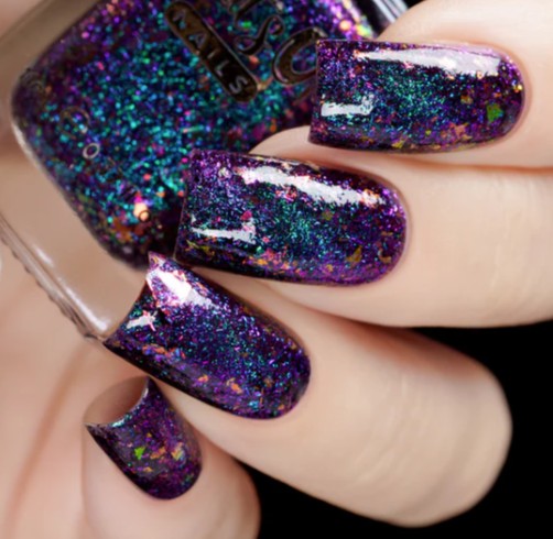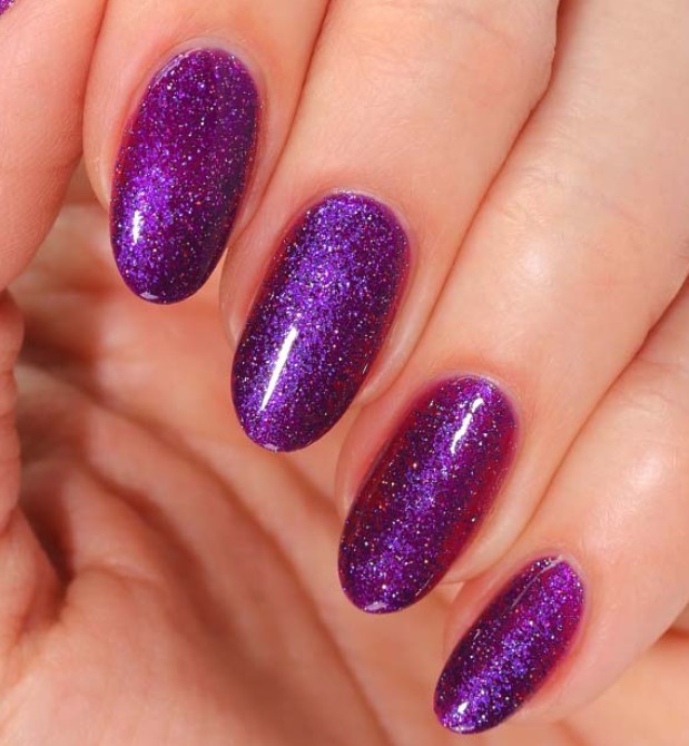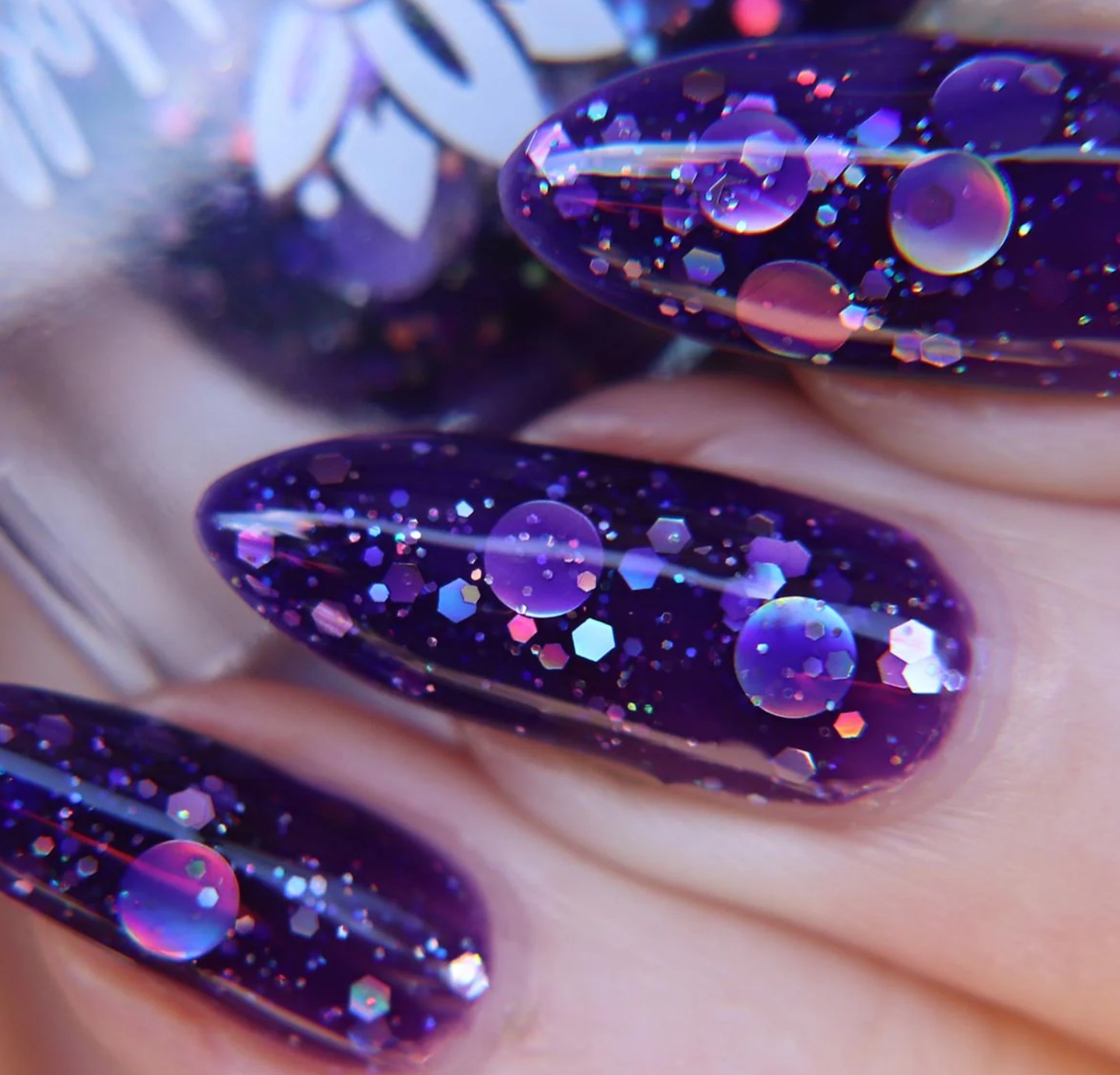 Deep mullberry purple base with intense blue/purple shimmer and holographic silver flakes