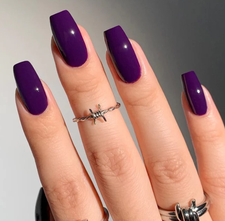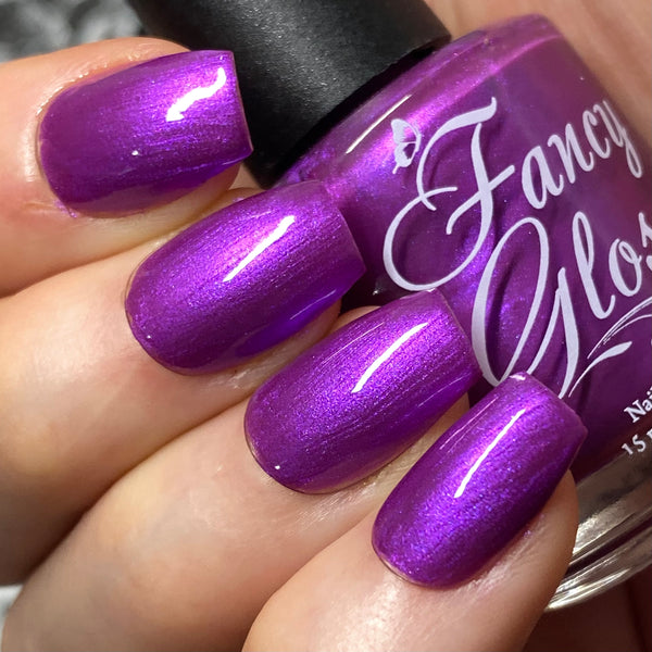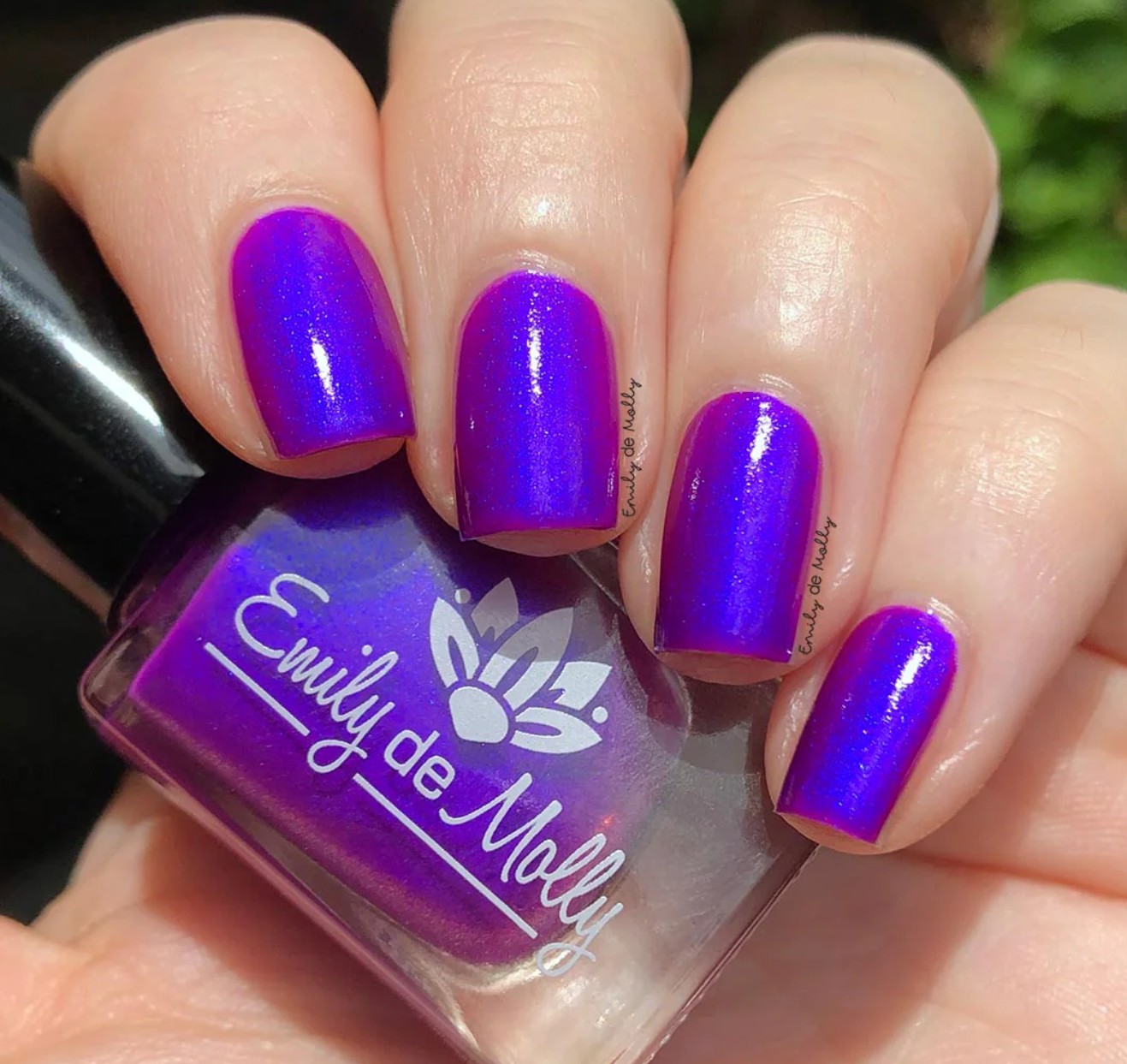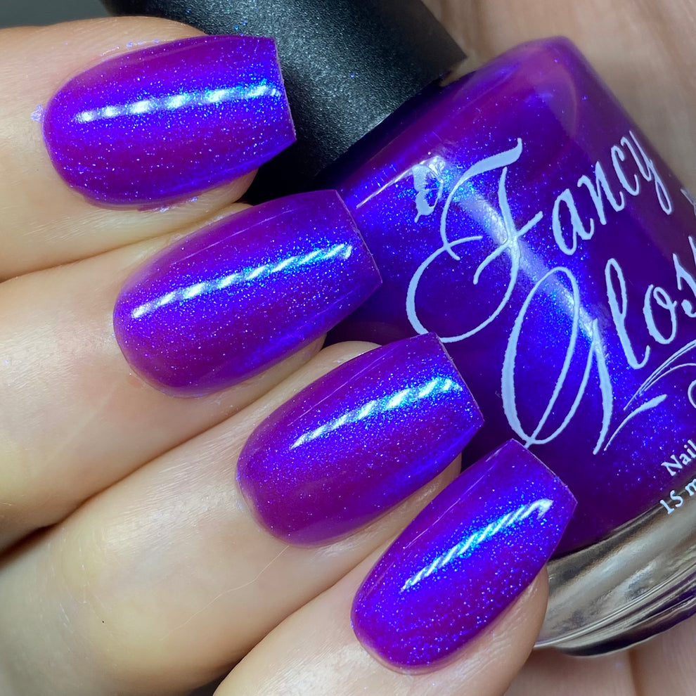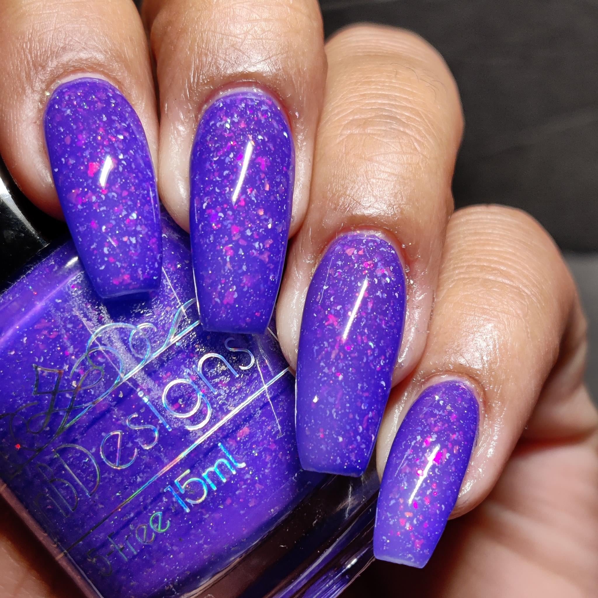 Deep mullberry purple base with intense blue/purple shimmer and holographic silver flakes