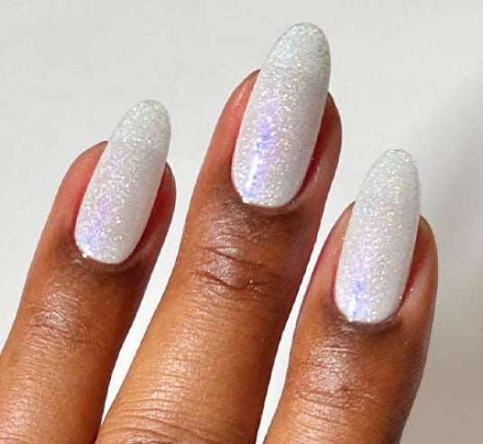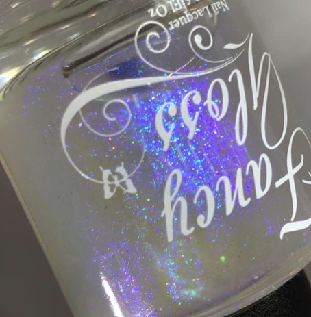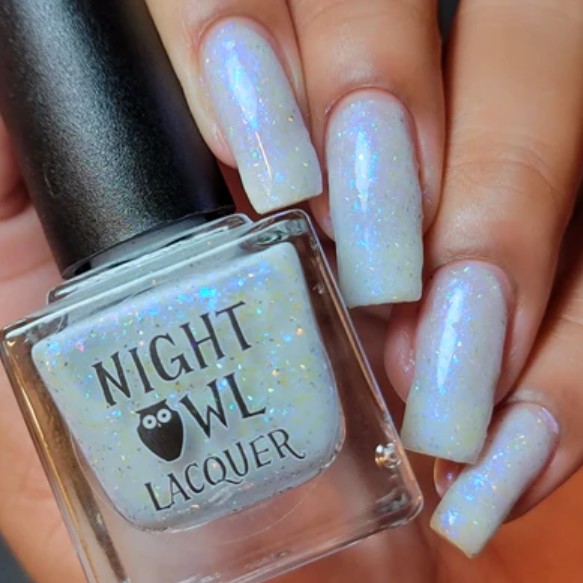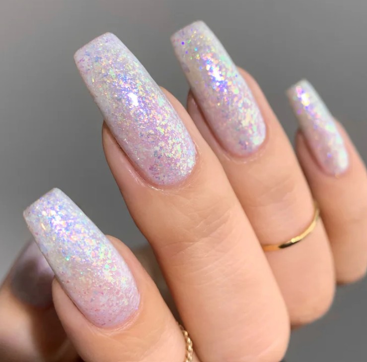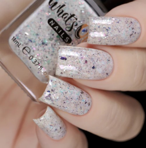 Milky white crelly filled with glowy aqua/blue/violet shifting crystal chameleon flakes and silver holographic shreds