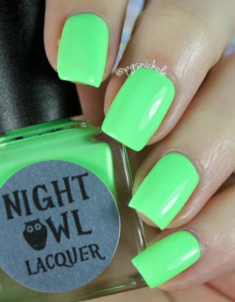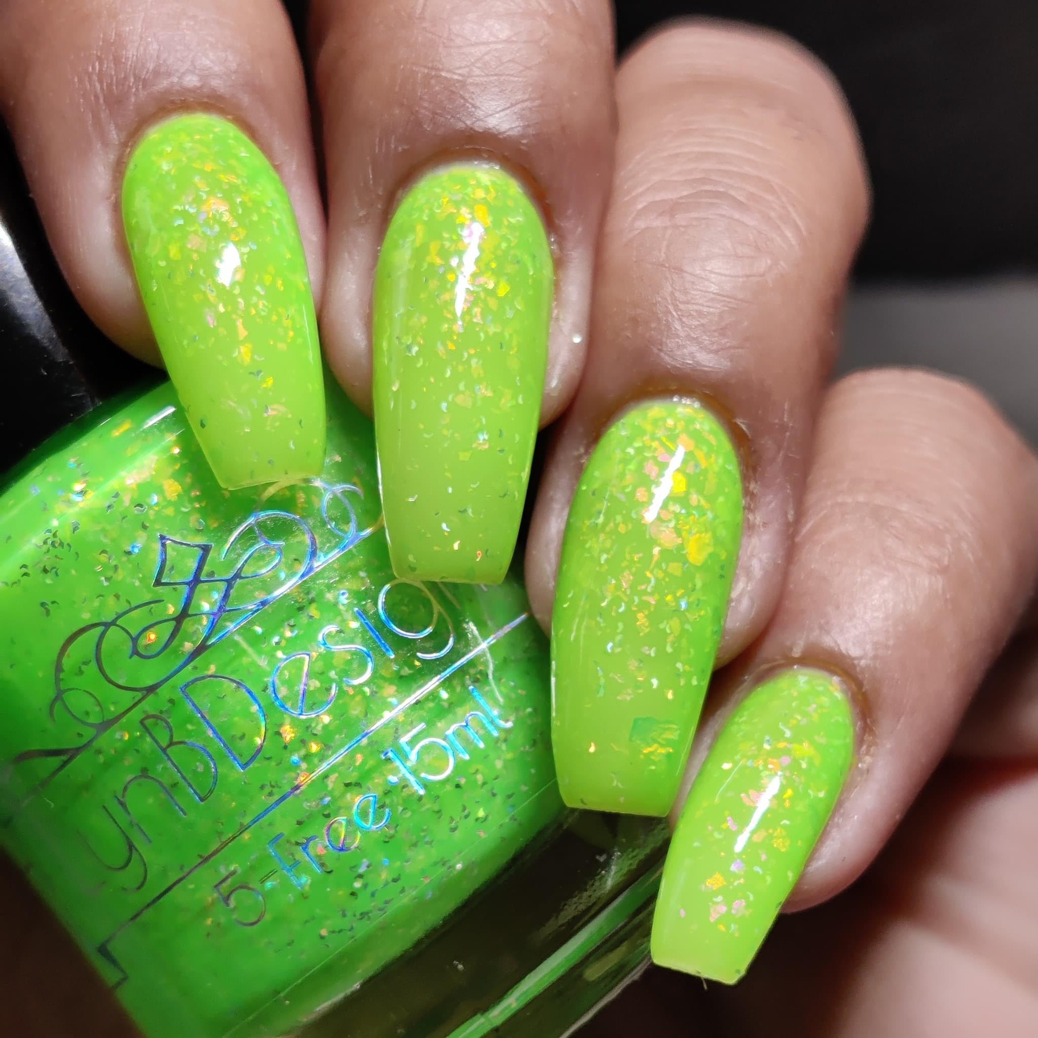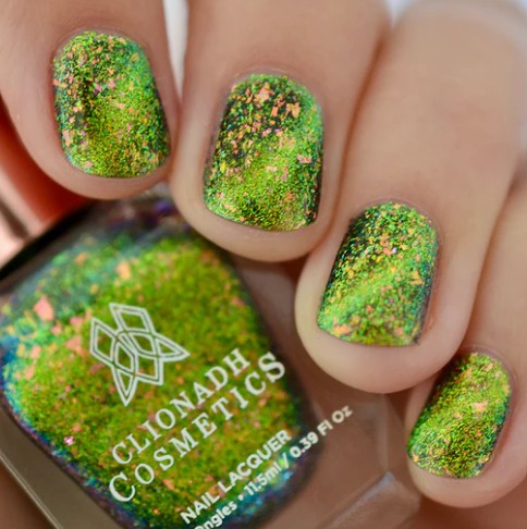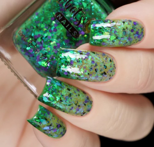 Bold kelly green to light grass green with purple hex glitter, black irregular glitters and green to purple iridescent flakies