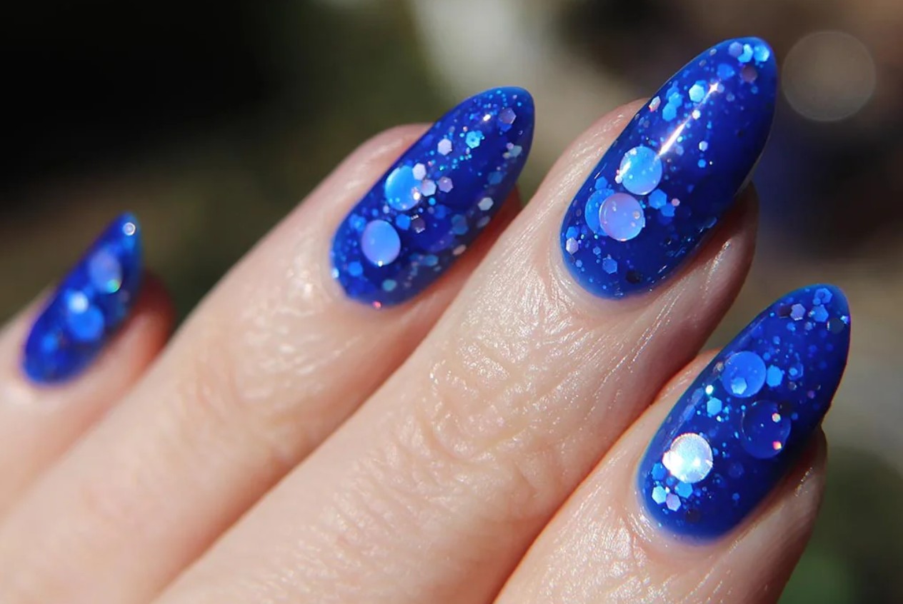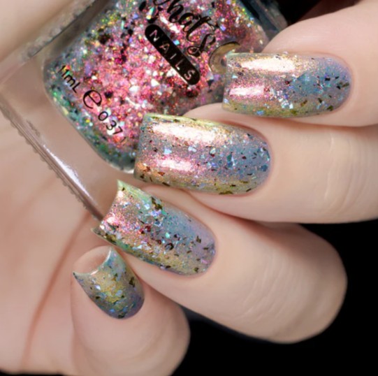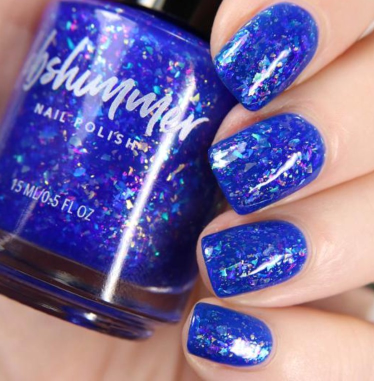 Muted blue filled with pink to green iridescent flakies, blue to purple shimmer, and small blue flash reactive glitter
