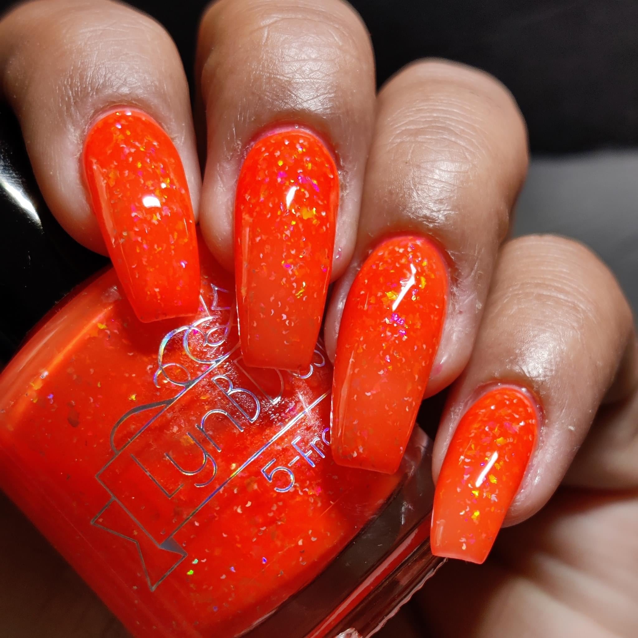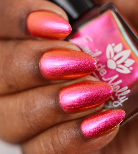 Blue jelly base filled with orange reflective glitter and a UCC purple to pink gold magnetic effect