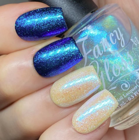 Dark blue base with orange to green magnetic flakies and green to purple iridescent flakes
