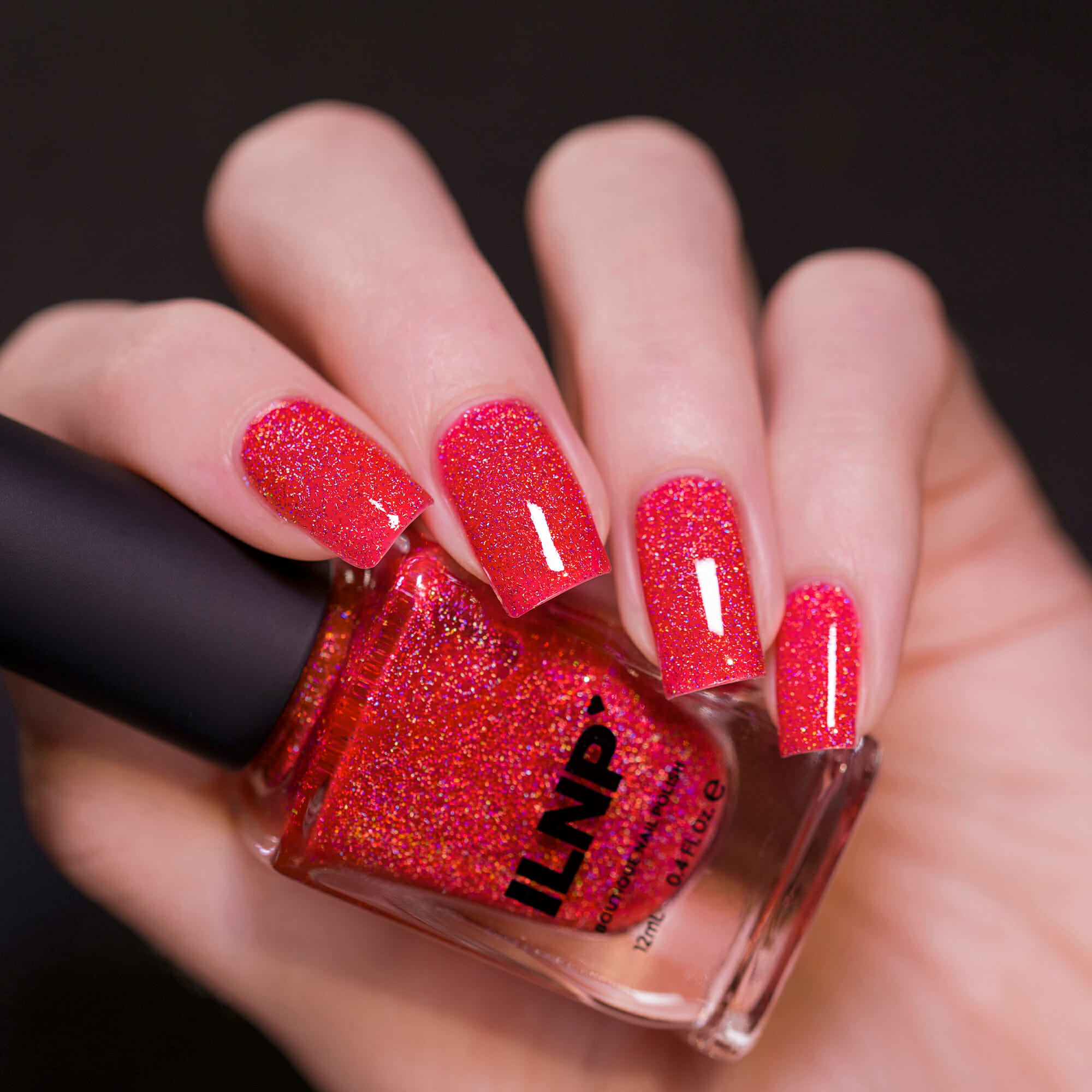 Oxblood red with an indigo blue-purple color shifting aurora shimmer and an intense scattered holographic