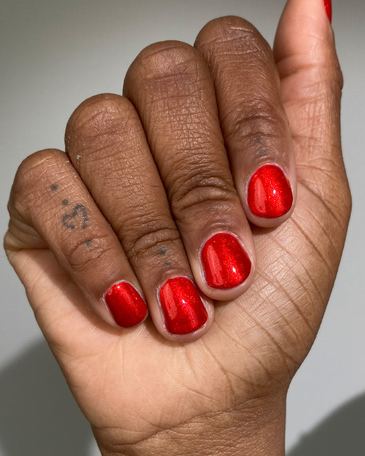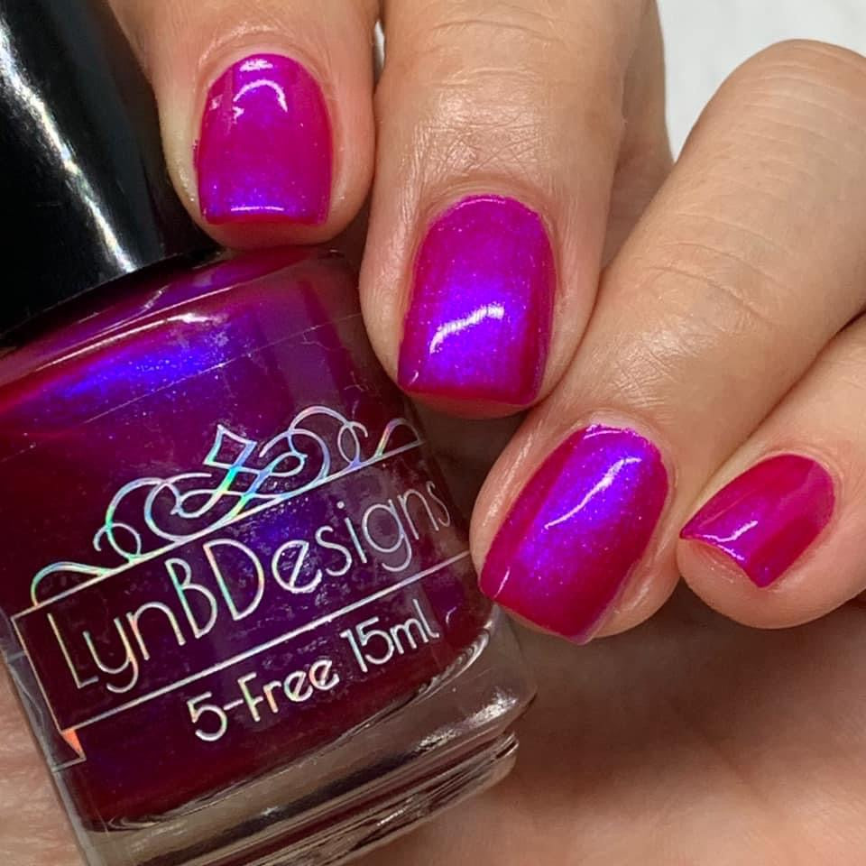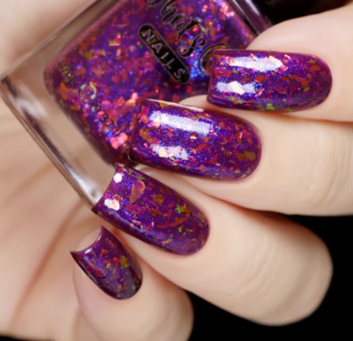 Reddish purple polish filled with blue shimmer and color-shifting orange-to-pink iridescent flakies