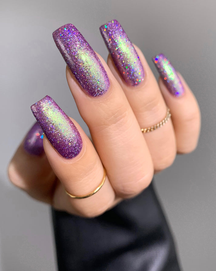 Duochrome filled with holographic glitter that shifts between shades of purple and green