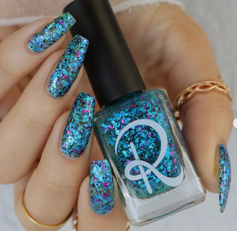 Turquoise/blue/purple magnetic pigment, holographic flakes, magenta irridescent flakes, aurora shimmer, reflective glitter
